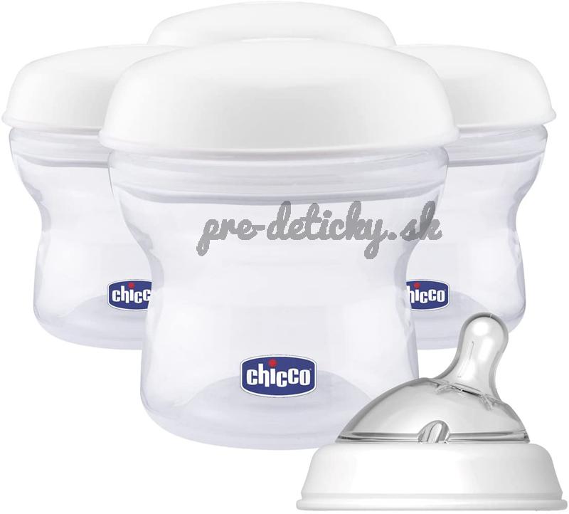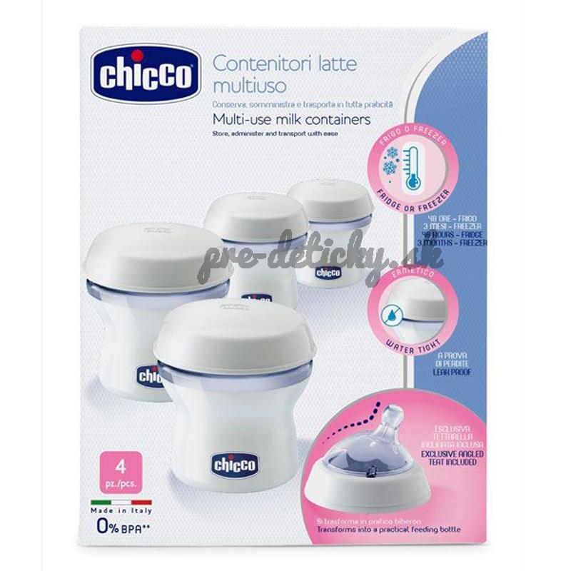 Nádoby na uskladnenie materského mlieka Chicco sú odstupňované tak, aby ste vedeli, koľko ste odsali. Ich maximálny objem je 150 ml. Priložené nálepky umožňujú poznamenať si dátum odsatia/uskladnenia. Zásobníky možno sterilizovať, zohrievať v mikrovlnnej rúre, ako aj vložiť do chladničky či do mrazničky. Umožňujú uchovávať mlieko v chladničke 3 dni a v mrazničke 3 mesiace (odporúčaná dĺžka uskladnenia materského mliečka).