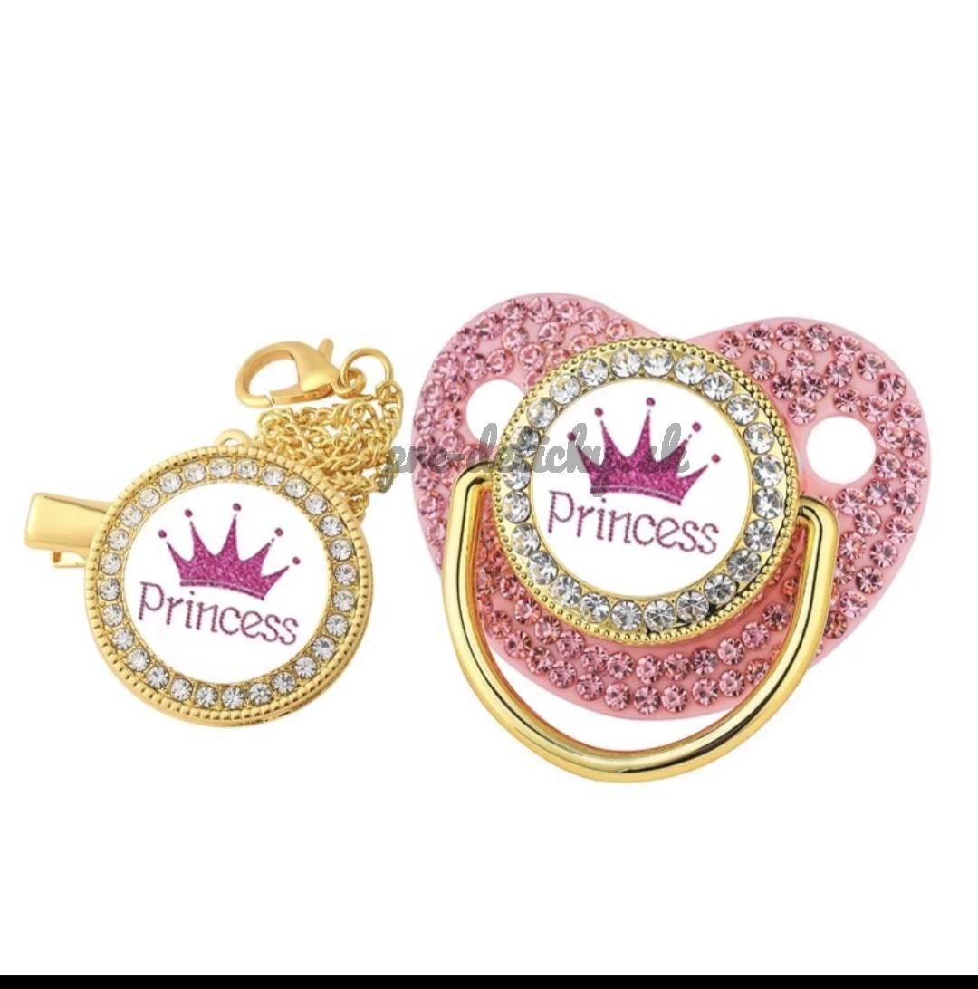 Elegantný cumlík s držiakom cumlíka, zdobený motívom koruny, je spojený s bezpečným cumlíkom a zaručuje bezpečnosť a štýl bez obsahu BPA.
