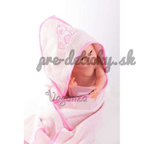 Krásna detská froté osuška s kapucňou, vyšívaným obrázkom a rukavicami na kúpanie.