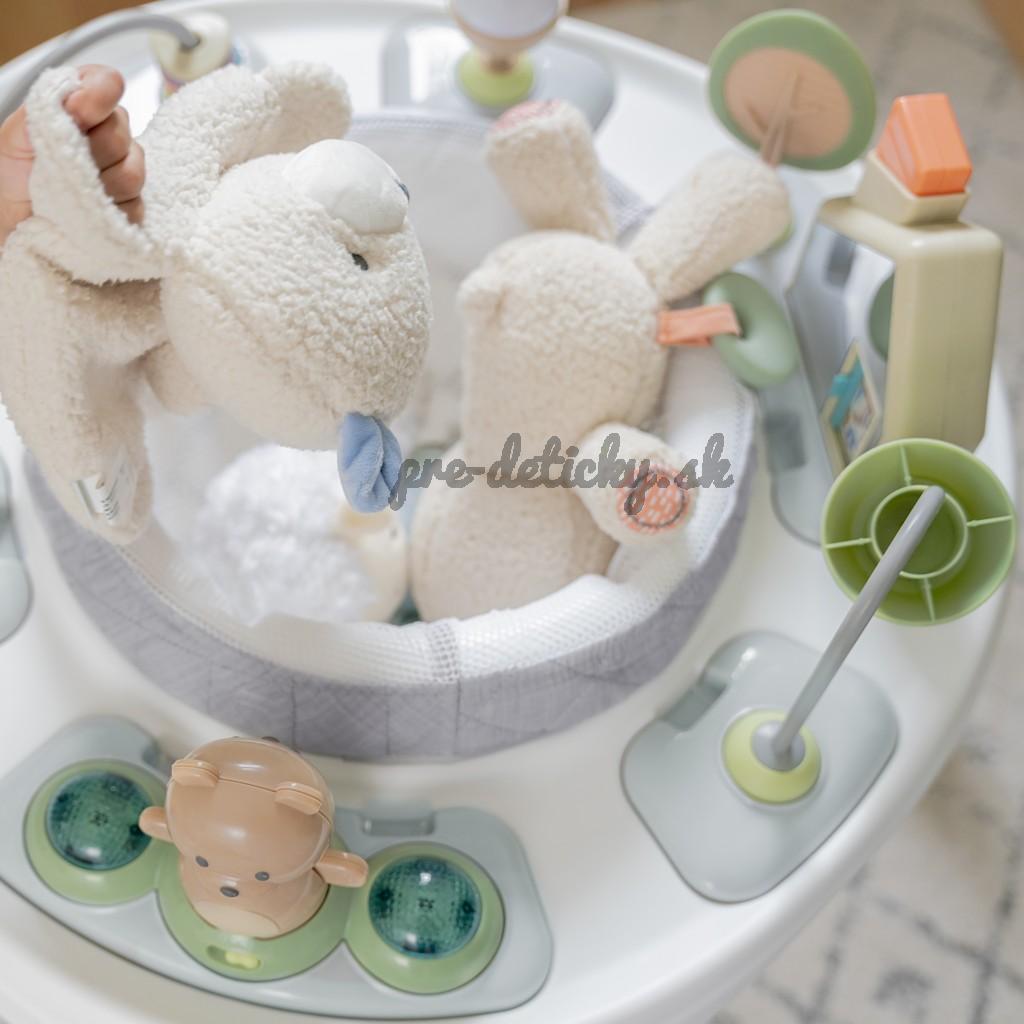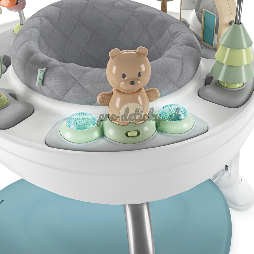 Zo sedadla a skákadla sa postupne stane stolík na hranie s aktivitami pre batoľatá aj so sieťkou na odkladanie hračiek. Aby si dieťatko mohlo oprieť nožičky alebo skákať od radosti v správnej výške je možné nastaviť výšku pružnej podložky na nohy do 3 rôznych polôh, podľa potreby dieťatka. Sedadlo skákadla sa otáča o 360 ° pre ľahký prístup ku všetkým hračkám a činnostiam. Interaktívny macko vydáva hravé zvuky, prehráva hudbu a svieti, čo aktivuje viaceré zmysly vášho dieťatka. Keď dieťa vyrastie, jednoducho vyberte podložku na skákanie a vytvoríte tak stojaci hrací stolík. Ľahko zameníte detské sedadlo za úložnú sieťku na hračky. Takto udržíte poriadok pri hrách, ale stále máte obľúbené hračky na dosah. Deti budú milovať 11 pútavých aktivít inšpirovaných prírodou so svetlami a zvukmi ako napríklad aktívny panel s medvedíkom, korálky na prevliekanie, domček so stromami. Neutrálny decentný dizajn, ktorý sa hodí do každého interiéru.