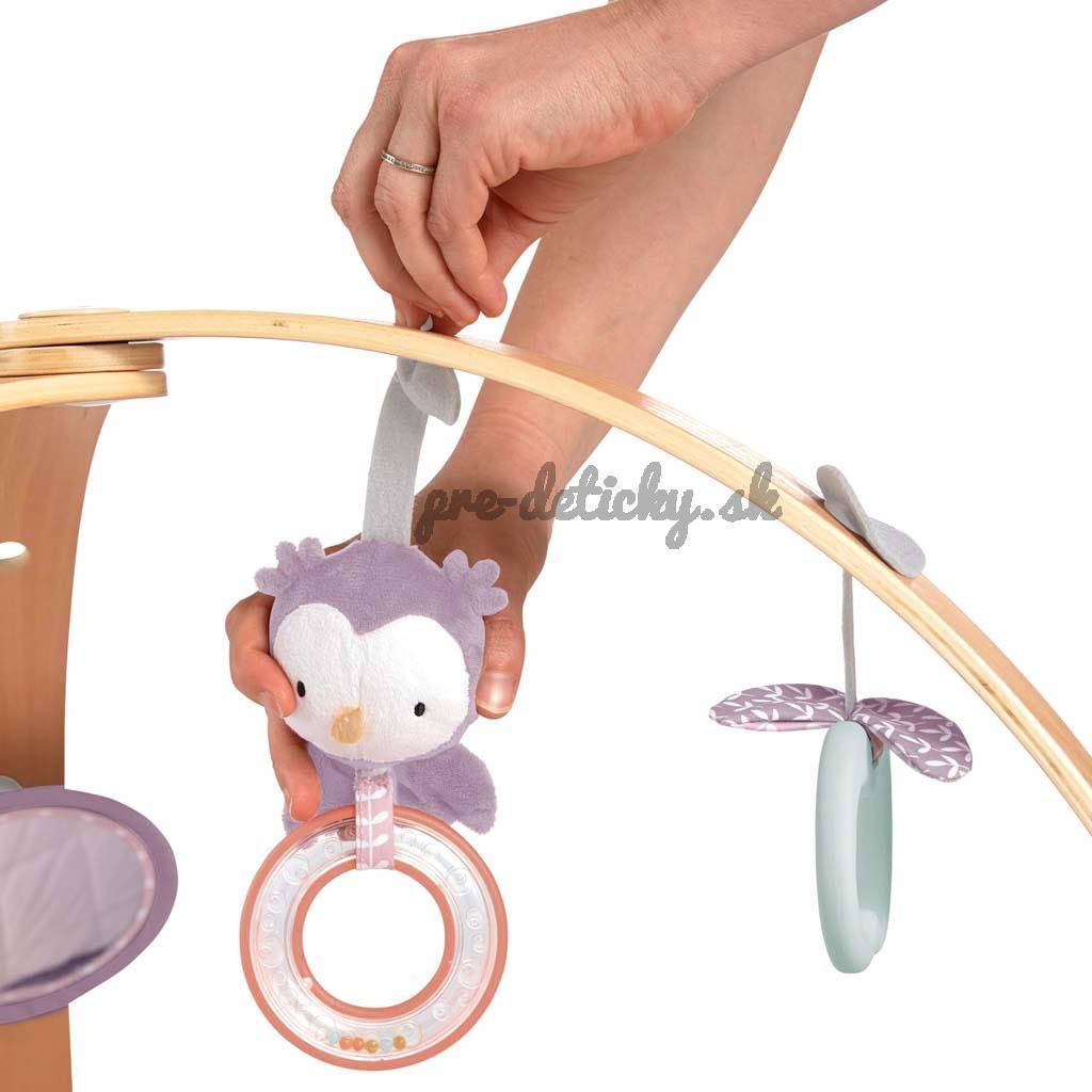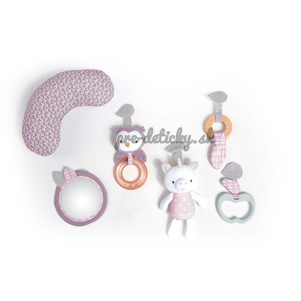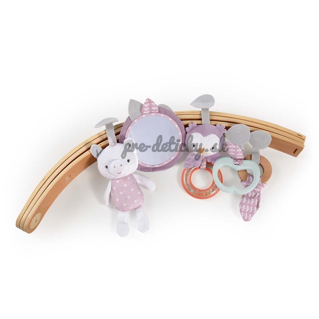 - obsahuje 6 odnímateľných hračiek na aktivity: plyšového jednorožca, hrkálku so sovou s korálkami, jabĺčko z prírodnej gumy, drevený krúžok, bezpečné zrkadielko a vankúšik na bruško