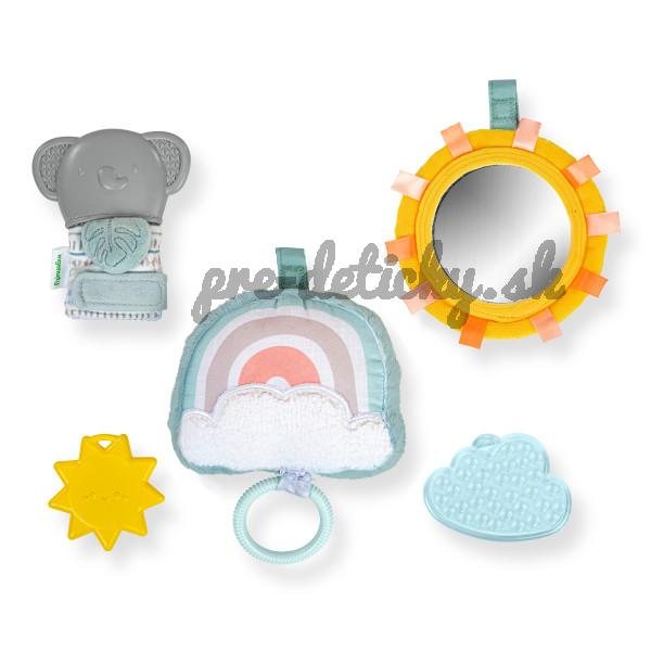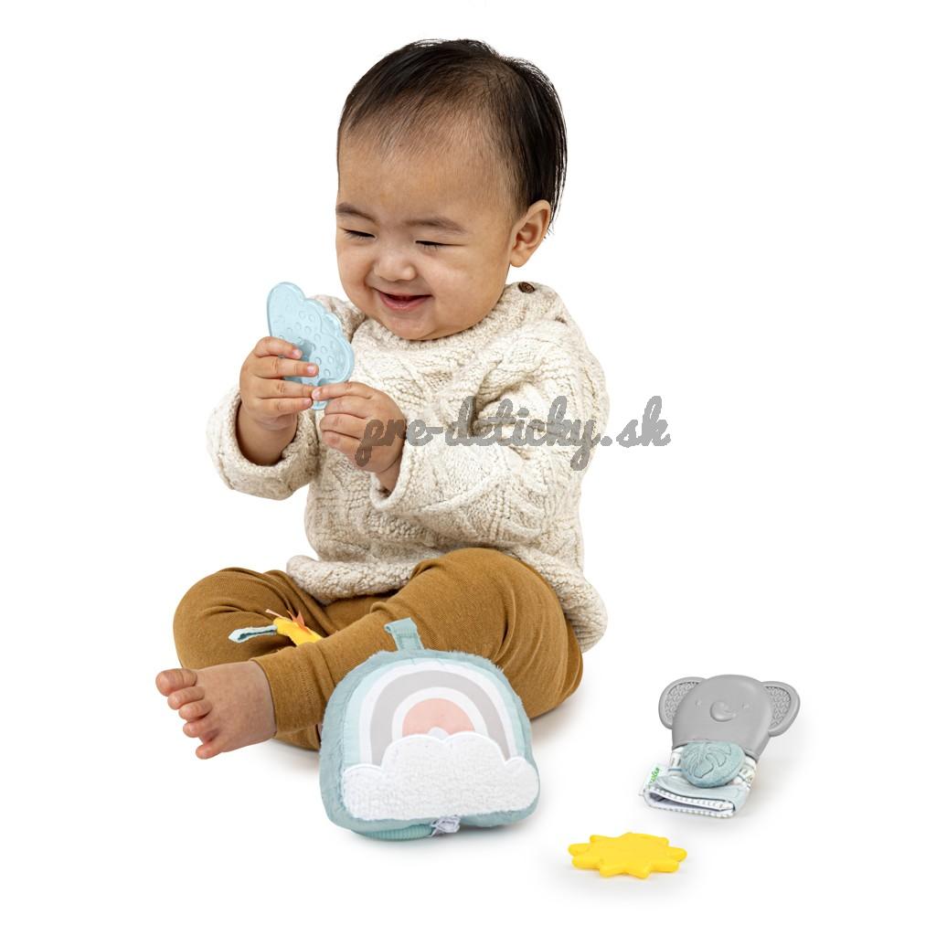 Súprava obsahuje hudobnú plyšovú hračku, hryzačku Van the elephant, slnečné zrkadlo s visačkami a 2 hryzačky bez obsahu BPA. Päťdielna súprava zapája zmysly dieťaťa tromi spôsobmi: hudobná plyšová hračka upokojuje jemnými zvukmi, rukavička na hryzenie a hryzačky prinášajú úľavu boľavým ďasnám a slnečné zrkadlo s visačkami ponúka upokojujúce skúmanie. Súprava podporuje hmatové zručnosti dieťatka vďaka tomu, že obsahuje základné pomôcky v rôznych textúrach a materiáloch.