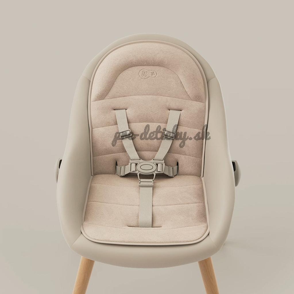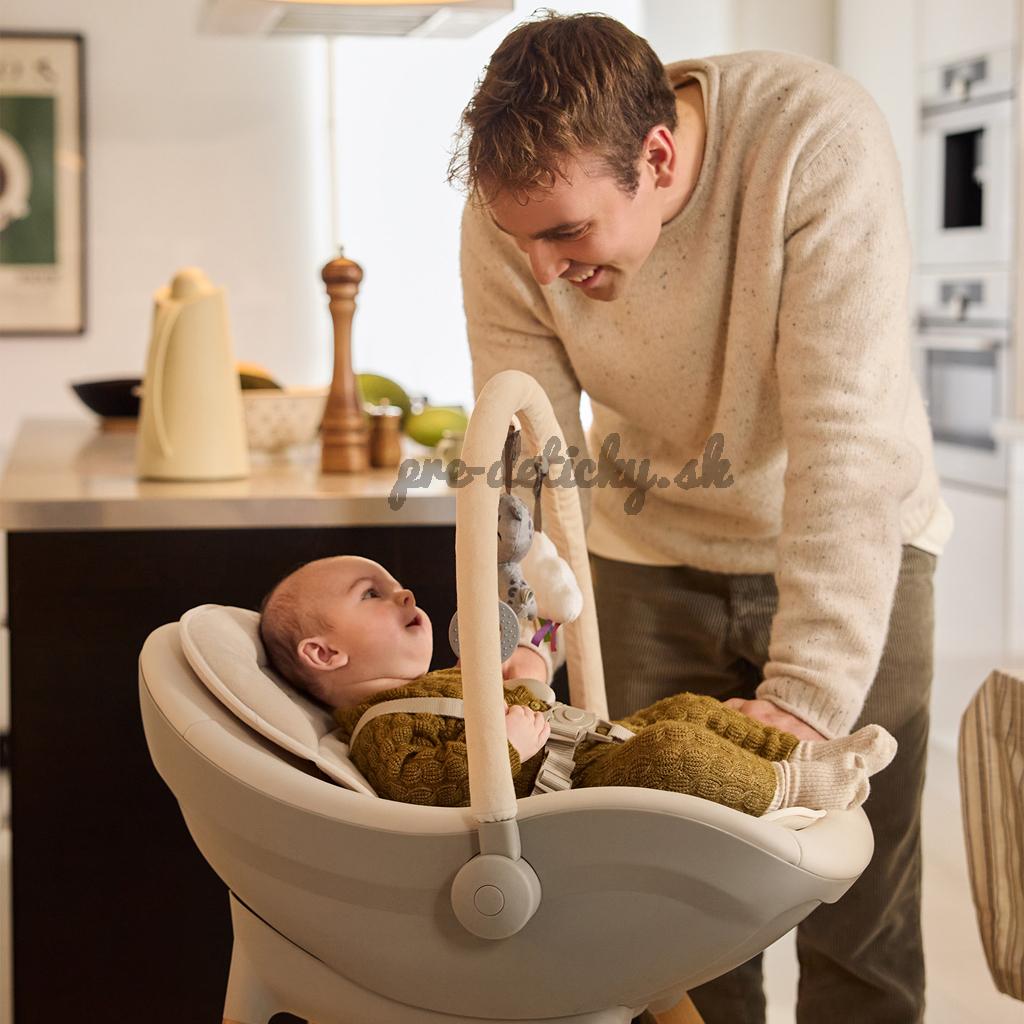 Súčasťou balenia je tiež mäkká novorodenecká vložka a hrazdička s tromi hračkami - drobnosť, ktorá zabaví ručičky a rodičom dopraje krátku, pokojnejšiu chvíľku. Celkový vzhľad dotvára bukové nohy, tlmené farby a mäkké materiály – FINI UP pôsobí ako premyslený kus nábytku, ktorý je súčasťou interiéru, nie ako „dočasná“ výbava. Po BLW nie je upratovanie boj - sedák aj pultík stačí rýchlo utrieť.