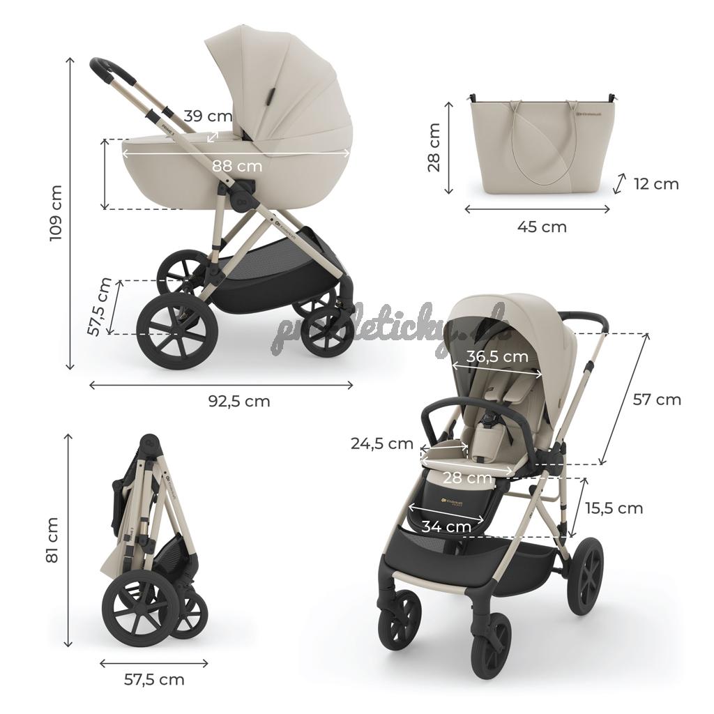 - Vybavenie v sade: hlboká korba, športová sedačka, rám s kolesami, taška pre rodičov, nákupný kôš