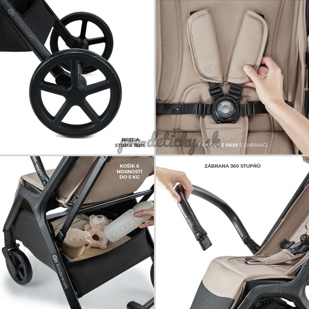 Kočík ponúka nastaviteľné operadlo, dve úrovne nastavenia opierky na nohy a otočné bezpečnostné madlo s možnosťou odpojenia, čo uľahčuje vkladanie a vyberanie dieťaťa z kočíka. Priestranný košík s kapacitou 5 kg pod kočíkom umožňuje pohodlné uloženie nákupov a ďalších potrebných vecí.