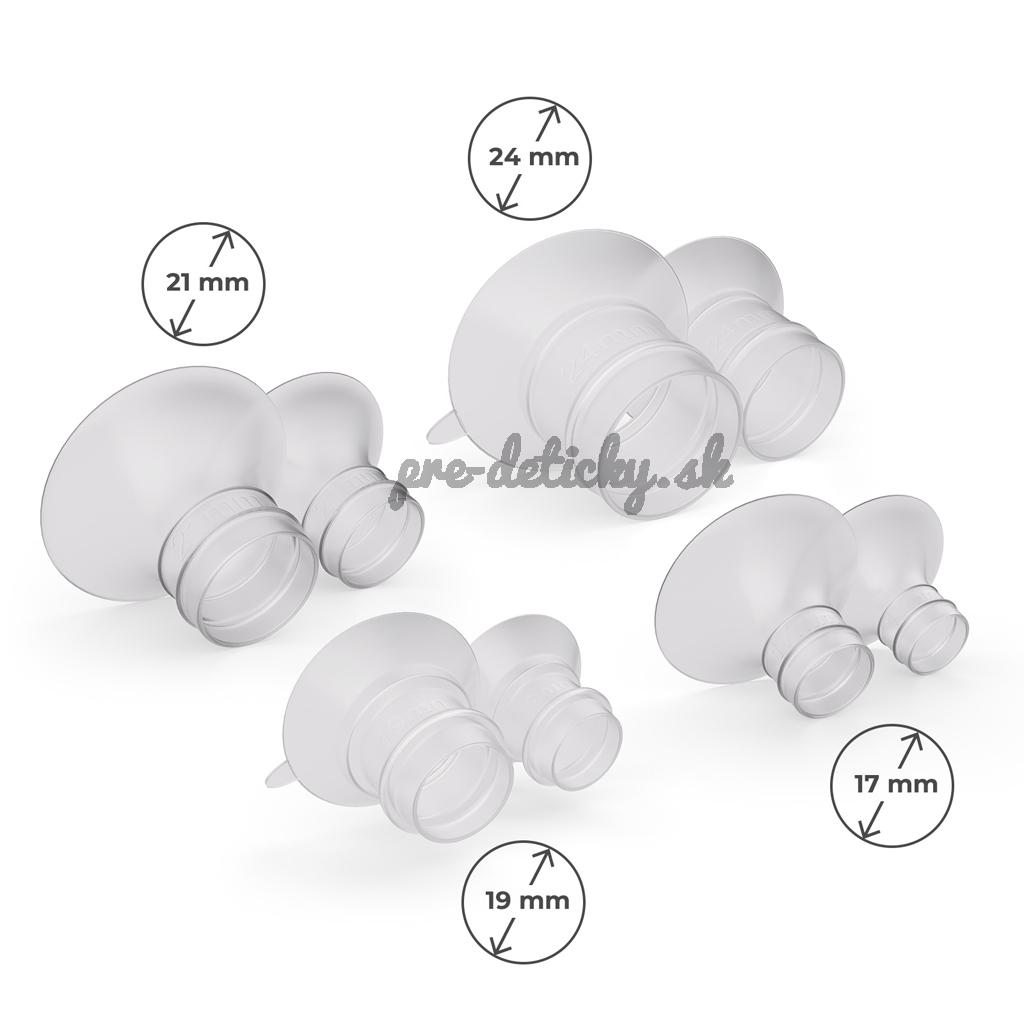 Sada obsahuje lieviky (17, 19, 21, 24, 27 mm), ktoré uľahčujú prispôsobenie odsávačky anatómii prsníka a zlepšujú utesnenie a pohodlie už od prvého použitia. Jedná sa o hmatateľnú úroveň pohodlia, ktorá ovplyvňuje nielen pocity mamičky, ale aj kvalitu a účinnosť odsávania mlieka.