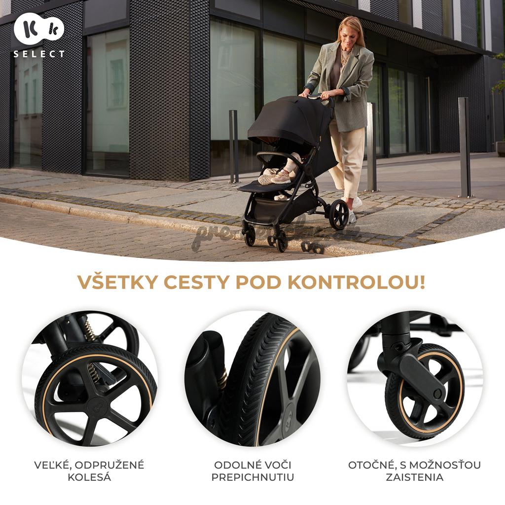Športový kočík MITZY má veľké, neprepichnuteľné kolesá, ktoré sú odpružené. Nezľakne sa vysokých obrubníkov, dláždenej ani štrkovej cesty. Predné kolesá sú otočné o 360° a dajú sa zablokovať pre jazdu rovno, čo uľahčuje riadenie kočíka na nerovnom teréne.