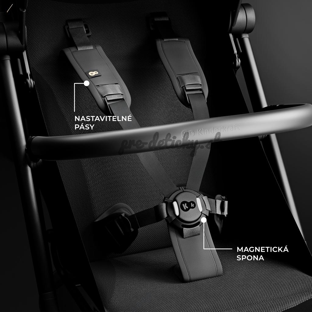 Magnetické, päťbodové bezpečnostné pásy zaručujú bezpečnosť a jednoduché používanie - zapnutie a odopnutie trvá len chvíľu. Bezpečnostný pás je tiež vybavený pohodlným výškovým nastavením, ktoré vám umožní prispôsobiť ho výške dieťaťa alebo hrúbke oblečenia bez toho, aby ste ho museli znova zapínať. Otočný nárazník, ktorý sa dá z oboch strán odobrať, navyše uľahčuje nakladanie a vyberanie dieťaťa z kočíka a poskytuje rodičom maximálny komfort.
