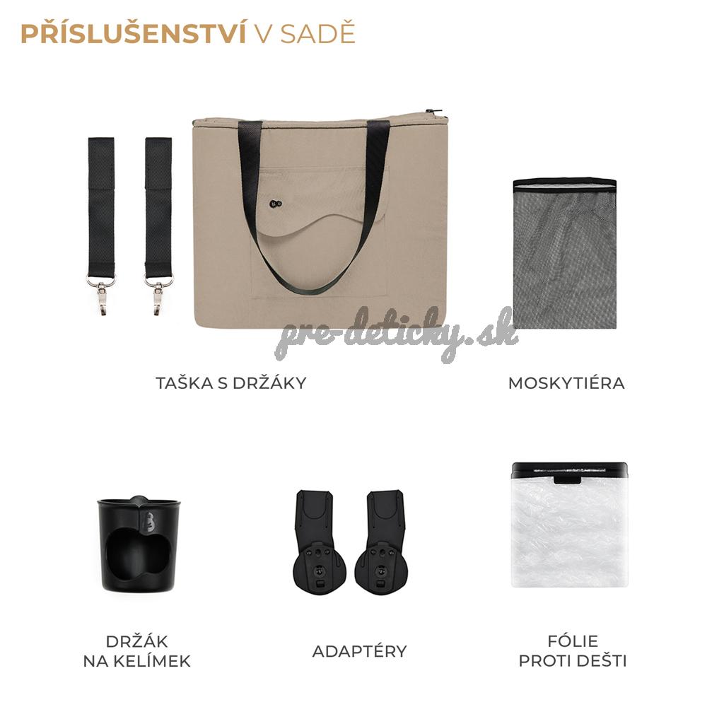 Kočík sa dodáva aj s celým radom praktického príslušenstva, ako je sieťka proti hmyzu, pláštenka proti dažďu, držiak na pohár, taška na rukoväť pre rodiča a adaptéry na detskú autosedačku. Adaptéry vám umožnia vytvoriť TRAVEL SYSTEM, ak už máte detskú autosedačku. A to všetko v jednom kočíku!