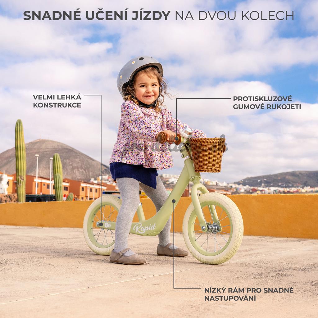 Odrážadlo RAPID má veľké, gumové kolesá s ložiskami. Zabezpečujú dobrú amortizáciu rovnako počas jazdy na chodníku, ako aj na nerovných, lesných cestičkách.