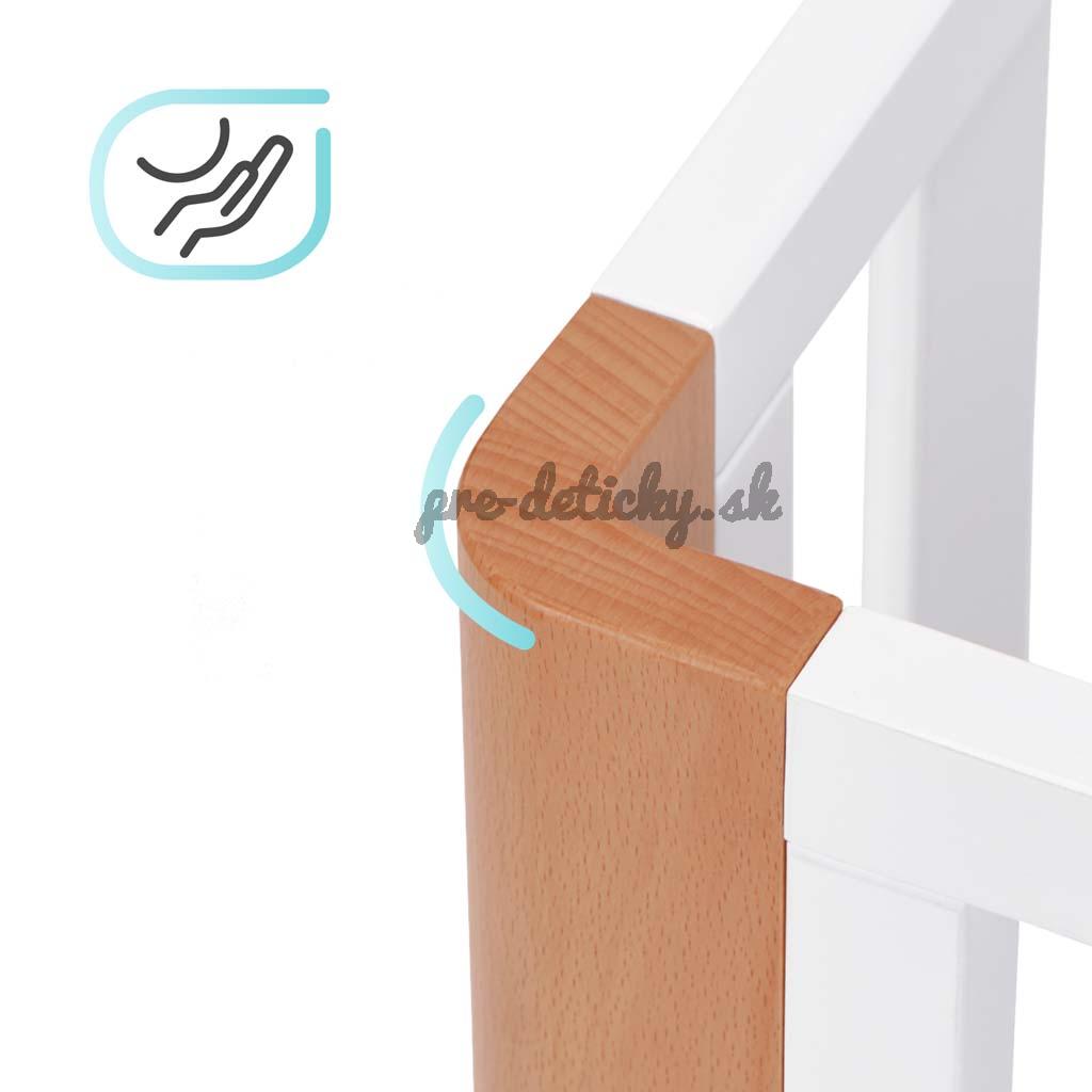 - všetky hrany postieľky sú zaoblené - to odstraňuje riziko odrenín alebo poranenia počas hry v ohrádke alebo vedľa postieľky.