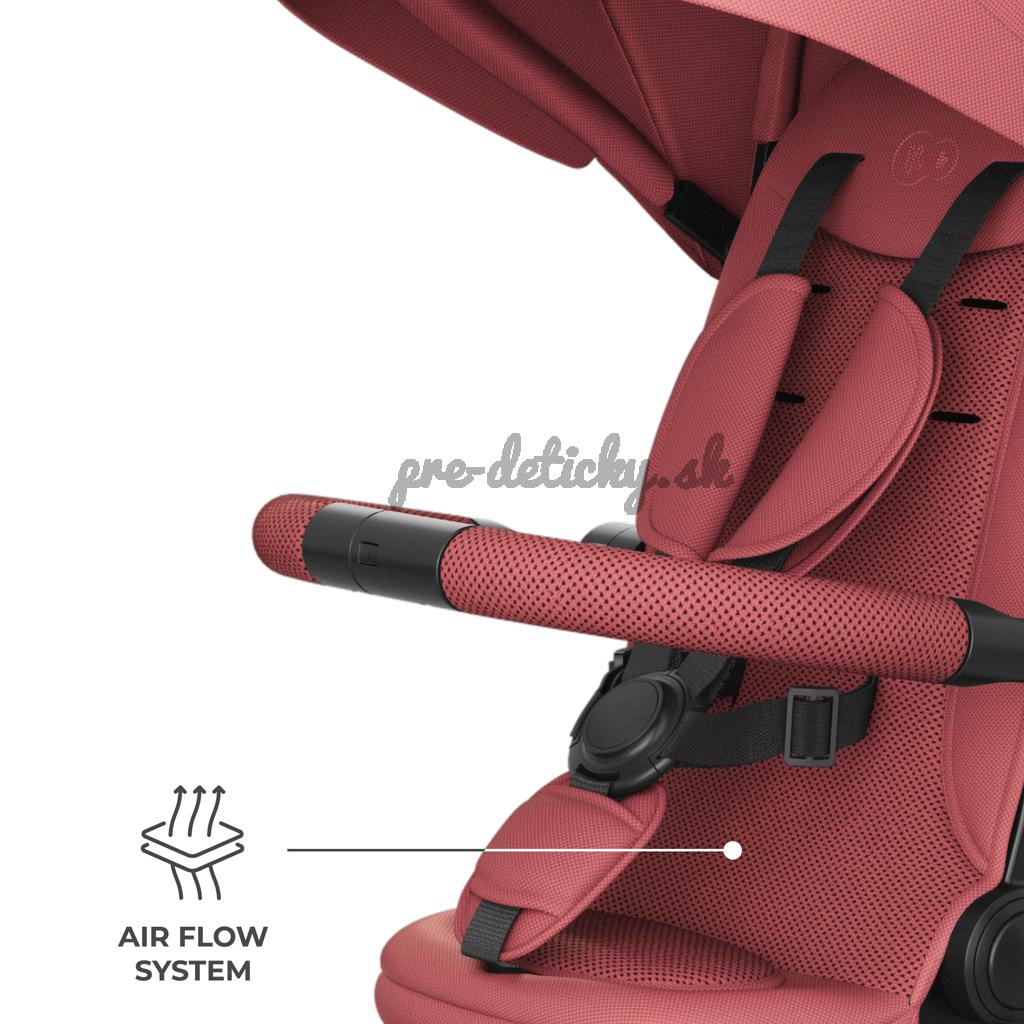 Na dlhších trasách výrazne pomáha pololežiaca poloha, dostupná ako po smere jazdy, tak proti smeru jazdy. Keď dieťa únavou zavrie oči, rodič rýchlo sklopí opierku a pokračuje v prechádzke bez narušenia denného rytmu. Pri jazde proti smeru jazdy môže dieťa odpočívať a vidieť na starajúcu osobu, čo často uľahčuje upokojenie a zaisťuje maximálny pocit bezpečia. Pohodlie dopĺňajú ventilované vložky AIR FLOW a nastaviteľná strieška s okienkom - ľahko ju prispôsobíte počasiu a počas jazdy na dieťa vidíte.