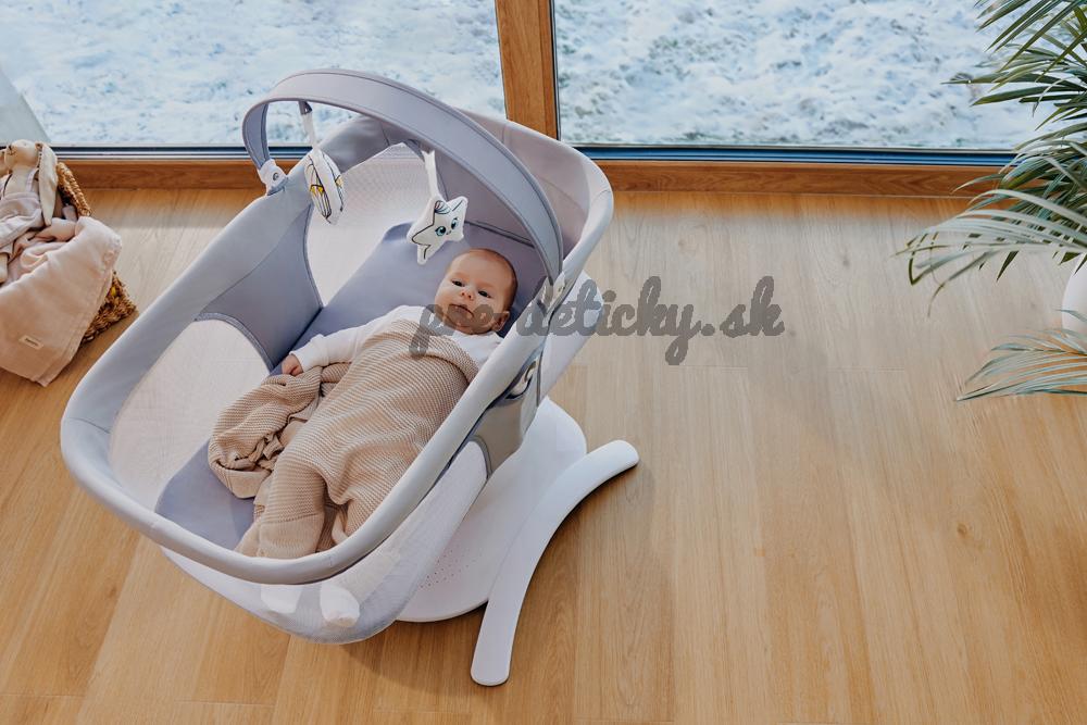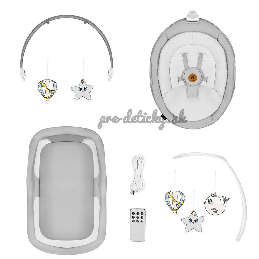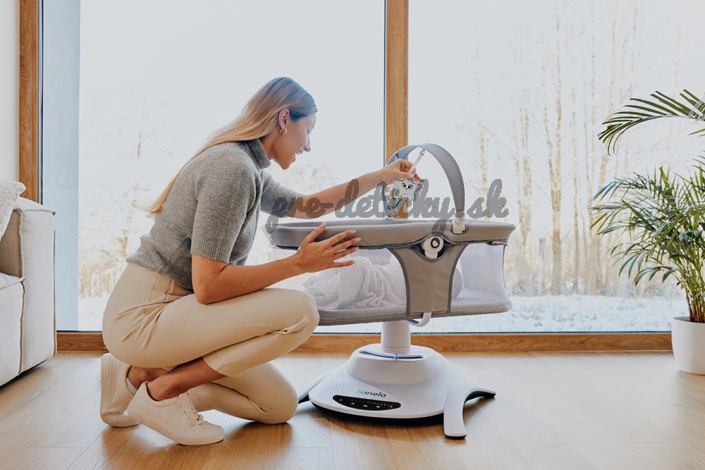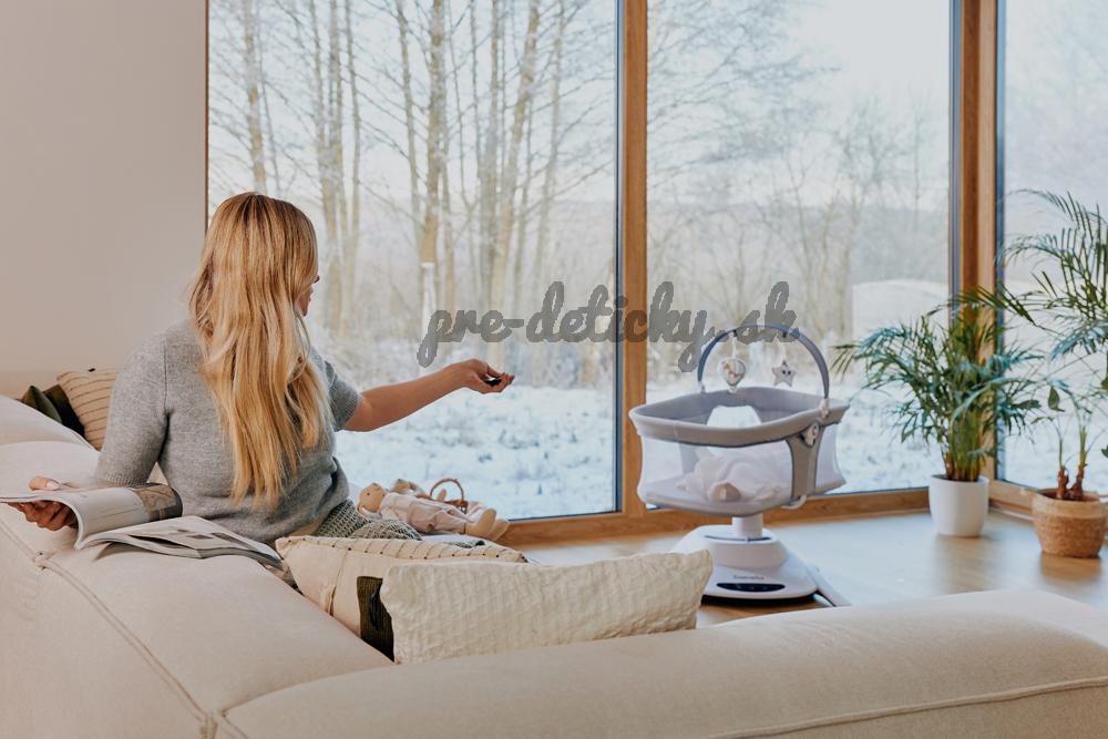 Funkcie, ktoré uľahčujú život: Kolíska je vybavená mnohými užitočnými funkciami, ktoré rodičom uľahčia život. Nočný režim spôsobí, že sa kolíska začne pomaly spomaľovať, až kým sa úplne nezastaví. Aktivácia automatického detektoru pohybu - zapne hojdanie a hudbu, keď sa batoľa začne vrtieť. Je to preto, že Bella sa o dieťa stará rovnako inštinktívne ako jeho opatrovateľ. O všetkých nastaveniach prístroja môžete rozhodovať na dotykovom ovládacom paneli alebo na diaľku pomocou diaľkového ovládania. Tento model hrá 12 pokojných melódií s ovládaním hlasitosti.