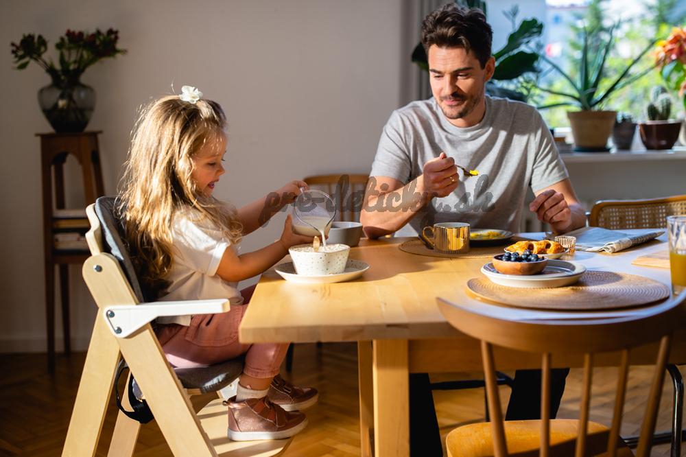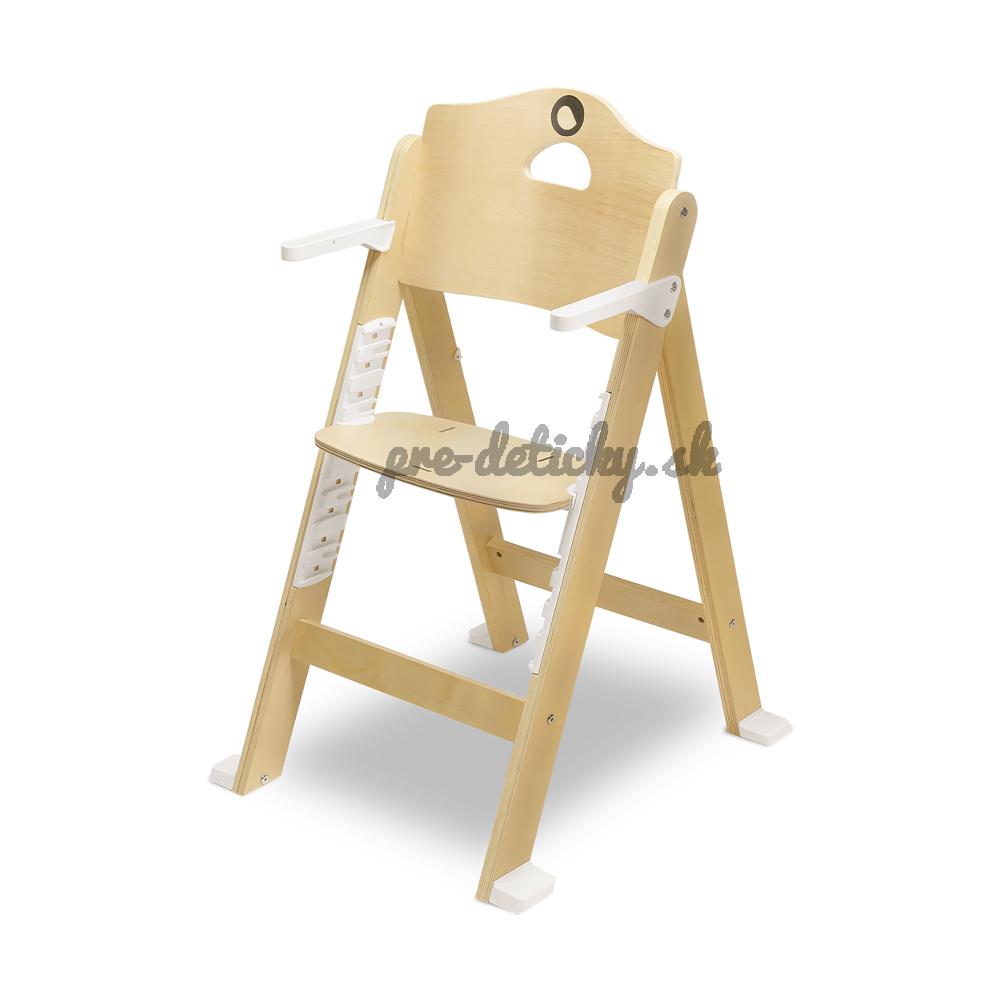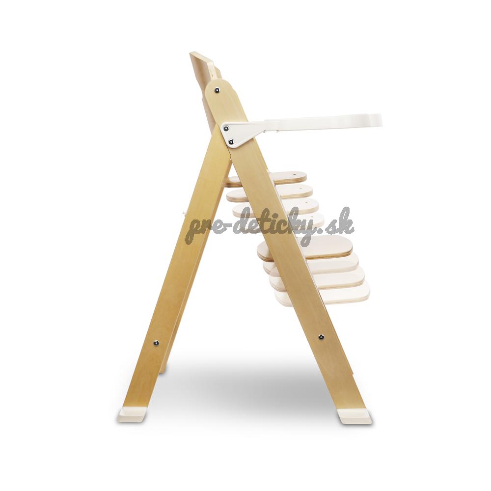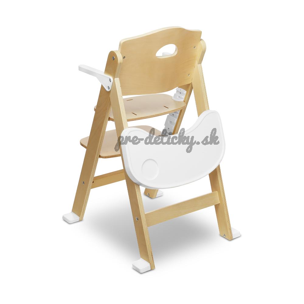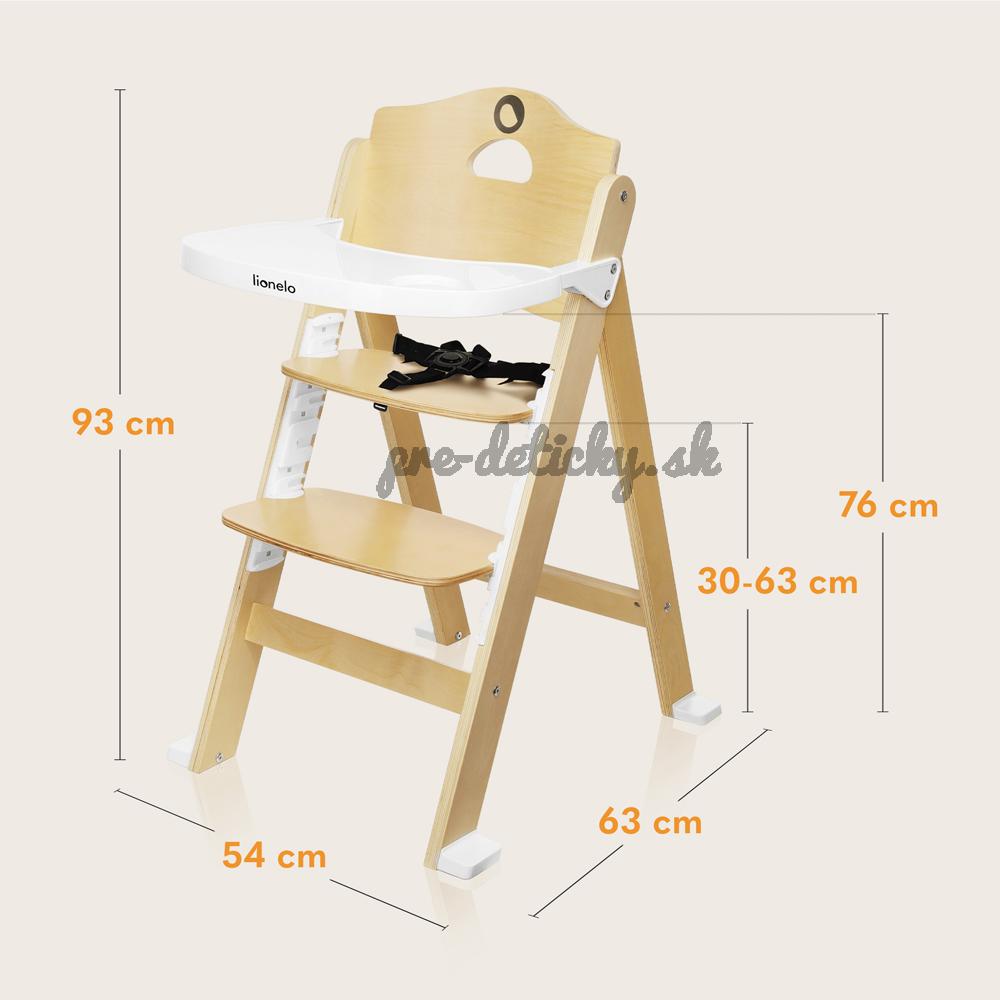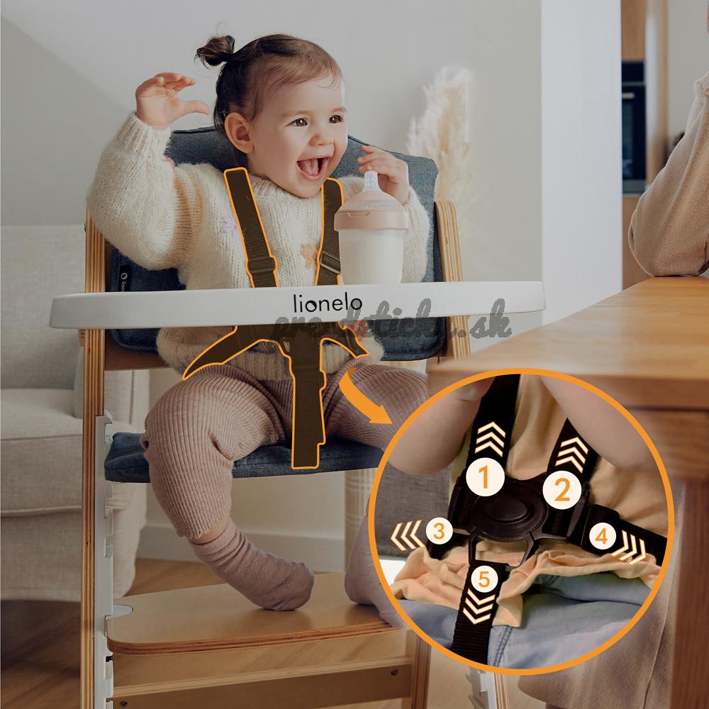 Bezpečná drevená konštrukcia: Päťbodové bezpečnostné pásy zaisťujú stabilnú polohu batoľaťa a odnímateľná opierka nôh poskytuje pevnú oporu pre nohy. Dieťa si tak pri jedle udrží správnu polohu v sede, čo má vplyv na správne fungovanie čriev, ako aj na vývoj rečového aparátu. Veľký podnos vytvára dostatočný priestor na jedlá - ideálna na rozšírenie stravy pomocou metódy BLW. Výrobok je v súlade s európskou normou EN 14988.
