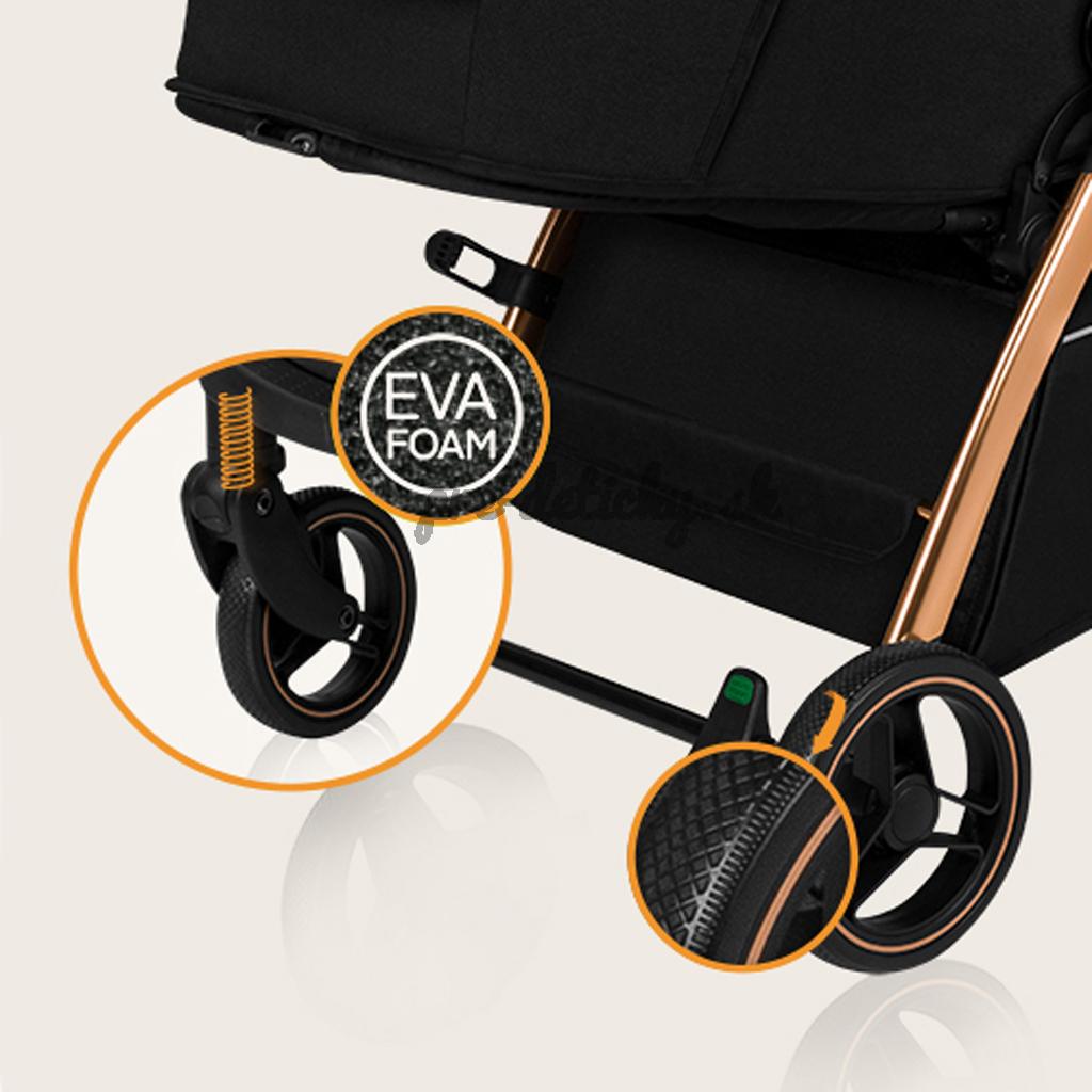 Univerzálne kolesá: Veľké bezúdržbové kolesá z EVA peny sa vyznačujú univerzálnosťou – sú ako ľahké, tak aj odolné. Vďaka možnosti otáčania o 360 ° sú kolesá veľmi dobre ovládateľné a zaisťujú manévrovateľnosť. Dvojité odpruženie umiestnené vpredu aj vzadu zaručuje pohodlie aj pri prekonávaní nerovností. Kočík má centrálnu nožnú brzdu so signalizáciou.