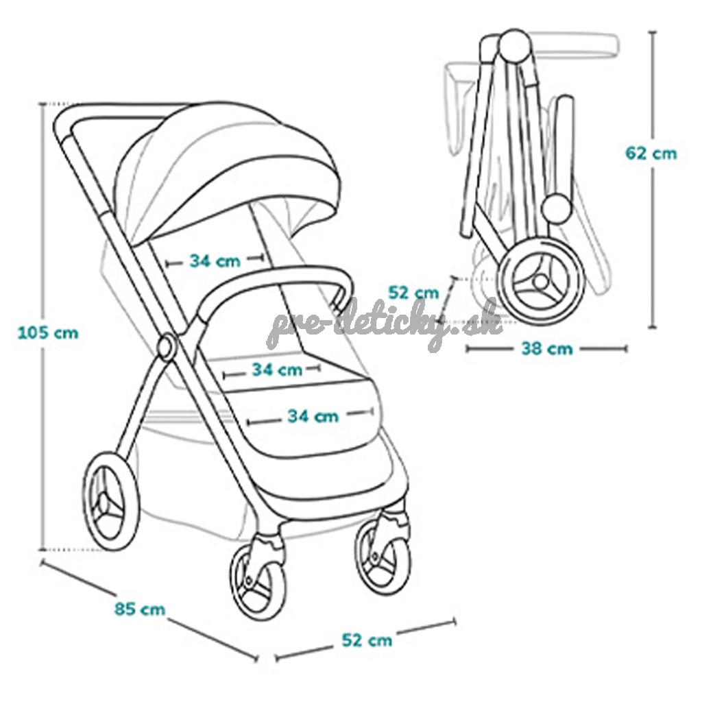 - Rozmery rozloženého kočíka: 85 d x 105 v x 52 š (cm)