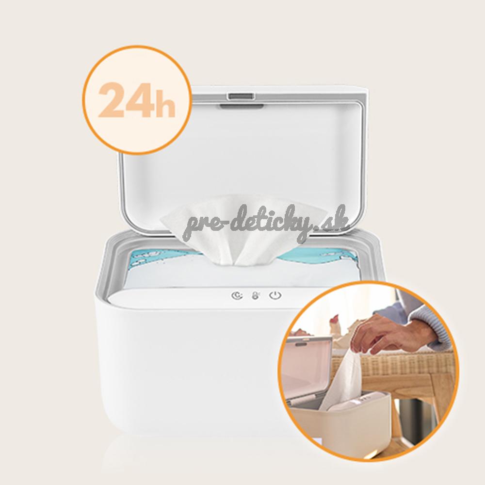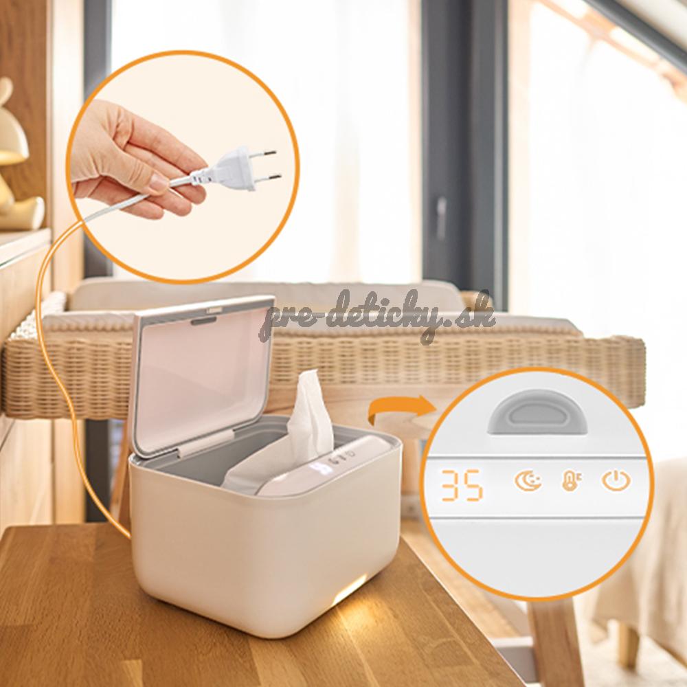 Teplé vreckovky kedykoľvek: Zariadenie ponúka aj funkciu udržiavania teploty – stačí vybrať jednu z troch stupňov a zaistiť prístup k napájaniu. Vďaka tomu sú vreckovky vždy pripravené na použitie – bez ohľadu na dennú alebo nočnú dobu. V prípade núdze nemusia rodičia čakať, kým sa ohrievač zahreje. Čo je dôležité, v zariadení je možné tiež ohrievať uteráky alebo žinky.