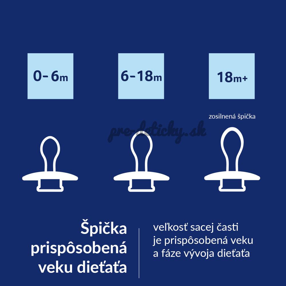Pred každým použitím starostlivo skontrolujte. Zatiahnite za cumlík všetkými smermi. Pri prvých známkach poškodenia alebo oslabenia materiálu výrobok vyhoďte. Používajte iba špeciálne stuhy alebo retiazky na cumlík testované podľa EN 12586. Nikdy na cumlík nepripevňujte iné pásky alebo šnúrky, mohlo by dôjsť k uškrteniu dieťaťa. Nenechávajte cumlík na priamom slnku alebo v blízkosti zdroja tepla. Nenechávajte cumlík v sterilizačnom roztoku dlhšie, než je odporúčané, mohlo by dôjsť k poškodeniu cumlíka. Uschovajte si návod na použitie, pretože obsahuje dôležité informácie. Kód šarže je na obale.