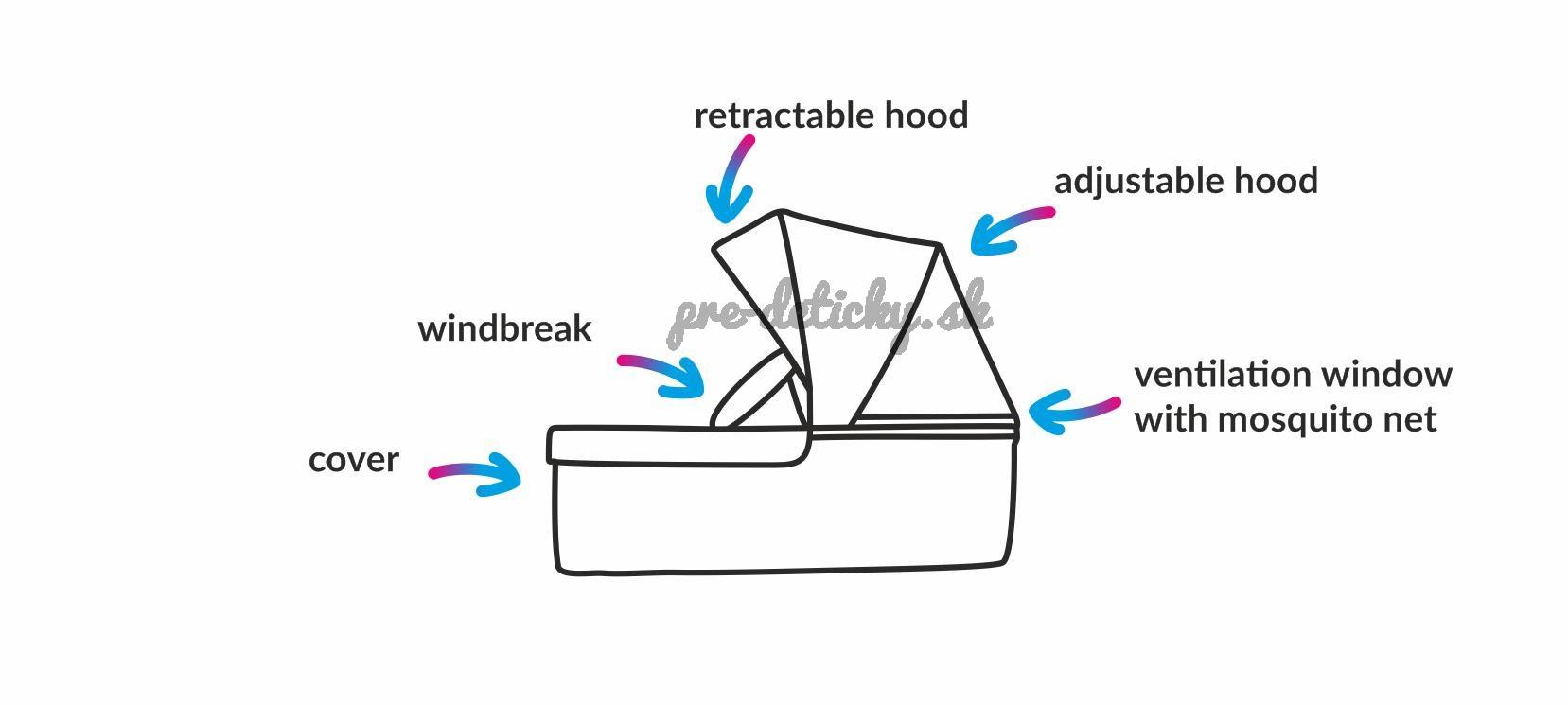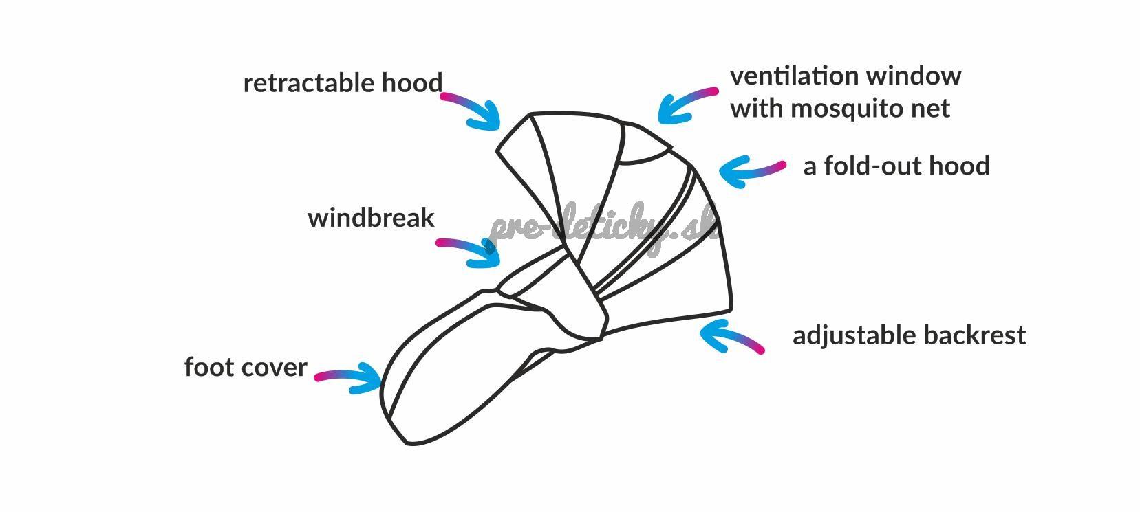 - slnečná clona s dvoma úrovňami, dostatočne ochráni dieťa v športovej sedačke pred vetrom aj slnkom,