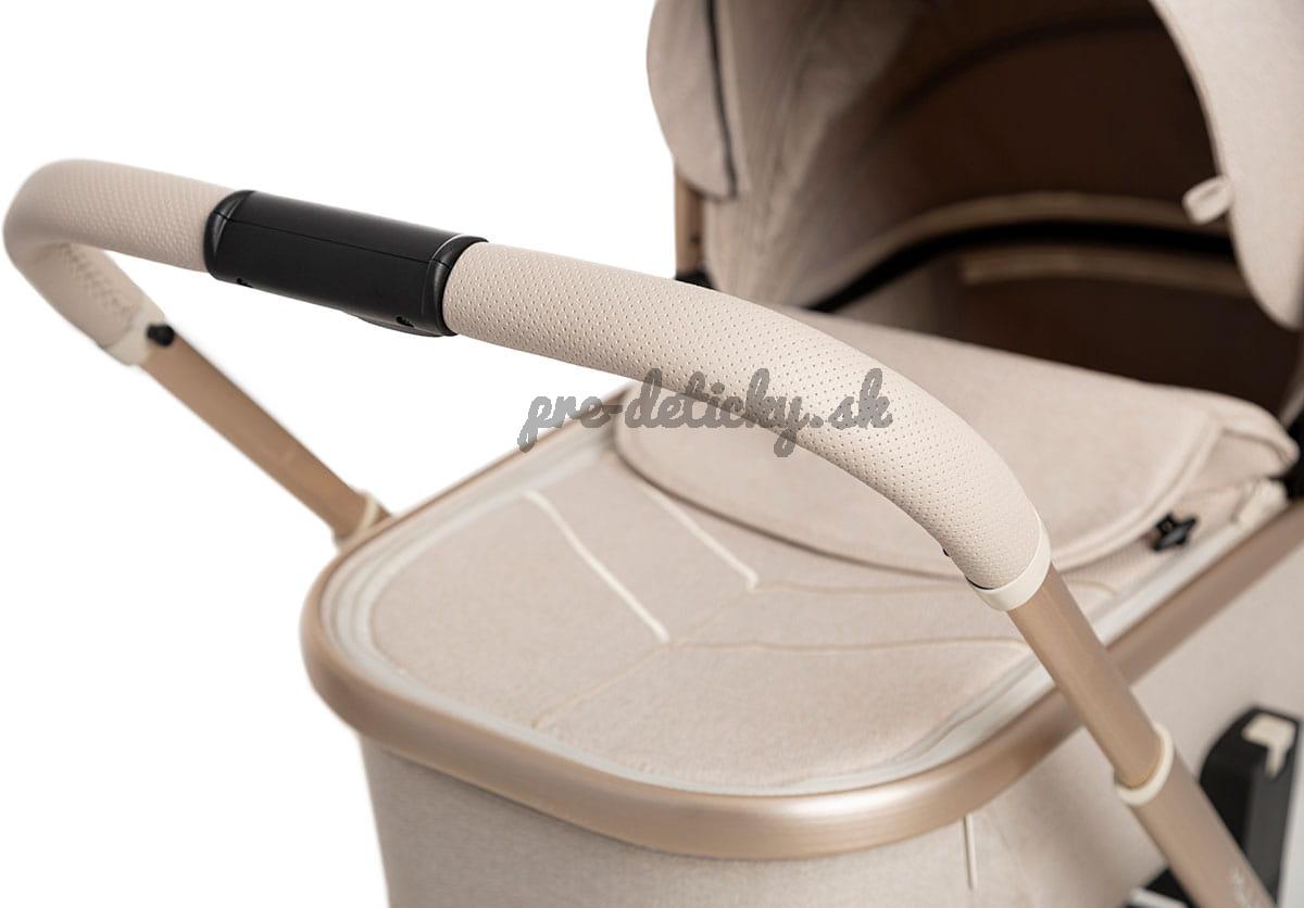 Rukoväť na tlačenie kočíka je mimoriadne príjemná na dotyk a elegantná – jej farba je dokonale zladená s farbou kočíka Quick Boho.
