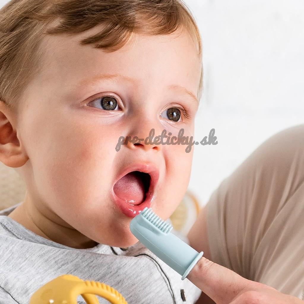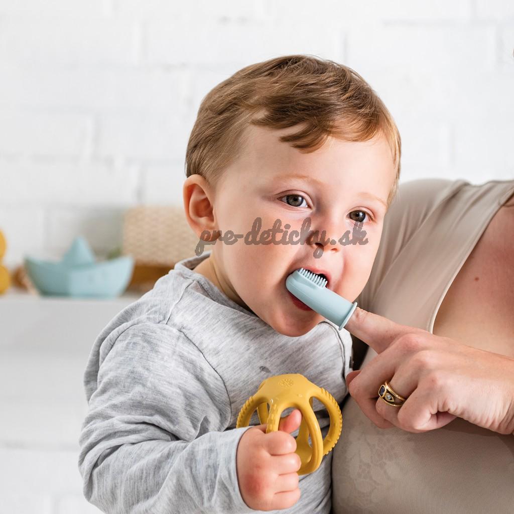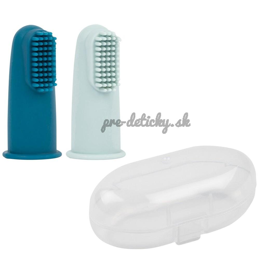 Prstová zubná kefka je prvá zubná kefka, ktorú použijete pre svoje dieťatko. Na jednej strane sú pružné silikónové štetinky veľmi šetrné k ďasnám a umožňujú vám dobre vyčistiť prvé zúbky a na druhej strane má kefka drsný povrch, ktorý umožňuje masírovať ďasná a zmierniť nepohodlie pri prerezávaní zúbkov. Kefka buduje a upevňuje návyky, aby si vaše dieťa zvyklo čistiť si zuby – robí z tohto každodenného rituálu potešenie a zabezpečuje dobrú hygienu a zdravie prvých zubov. Na štetinky môžete aplikovať prírodnú zubnú pastu alebo gél na úľavu od bolesti ďasien pri prerezávaní zúbkov. V balení je set 2 kusov kefiek spolu s puzdrom, ktoré chráni zubnú kefku pred baktériami a umožňuje vám ju vziať všade so sebou.
