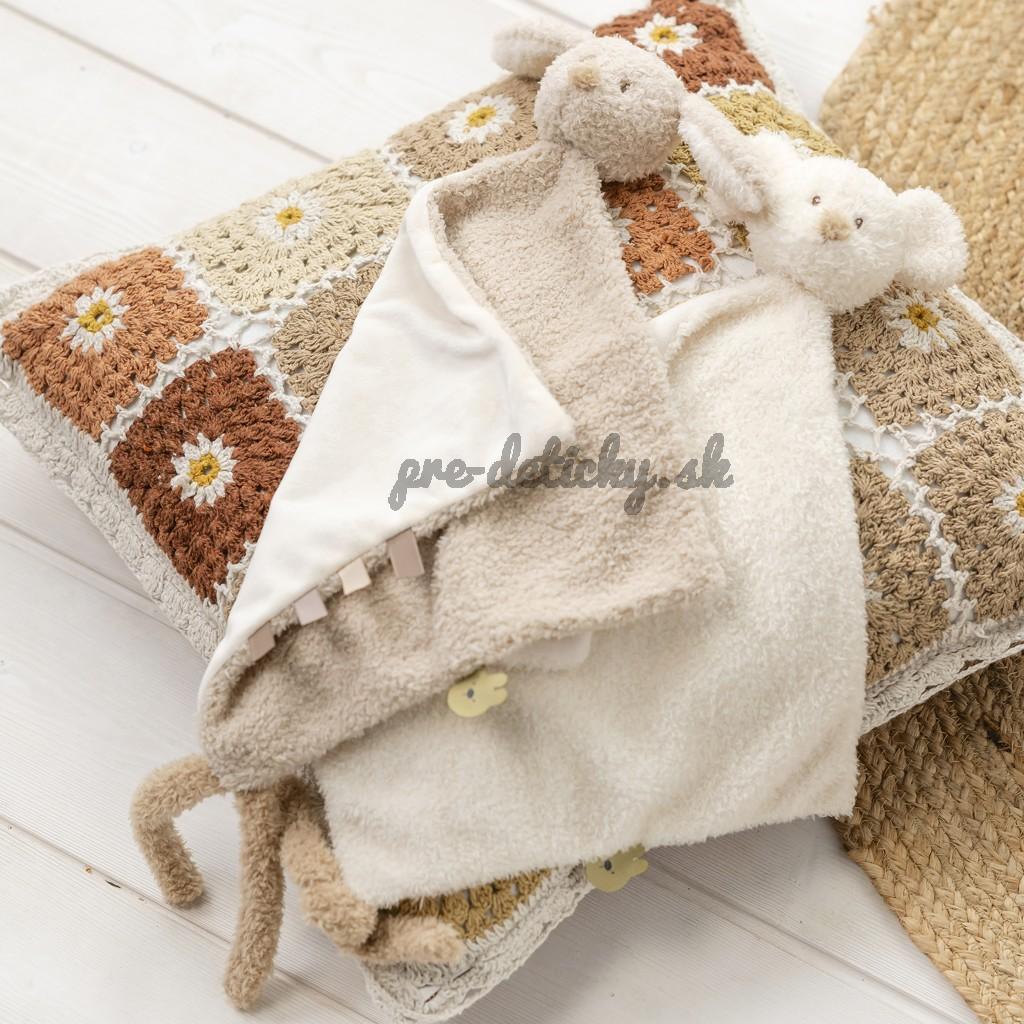 Mäkučká dečka s milým motívom ponúka množstvo úchopových možností, ktoré podporujú rozvoj zmyslov a jemnej motoriky. Dieťatko môže pohodlne chytať hlavičku zvieratka alebo zaujímavé visačky po stranách. Praktické pútko umožňuje pripevniť cumlík, aby bol vždy po ruke.