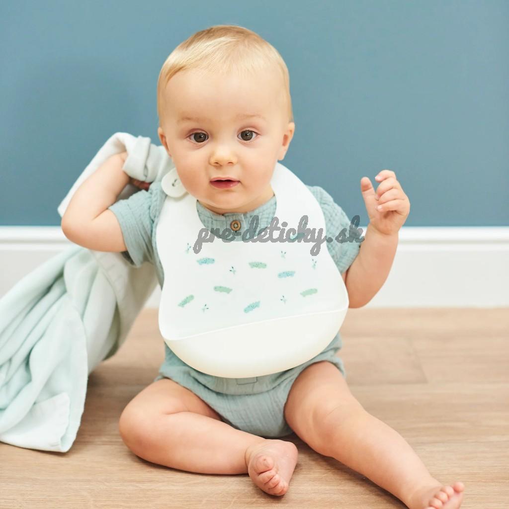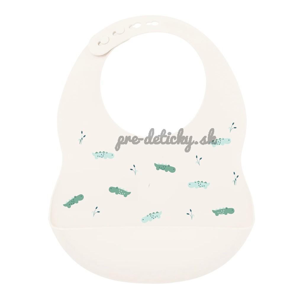 Podbradník Nattou vyrobený z pružného silikónu s motívom krokodílov a praktickou zbernou časťou zabezpečí kŕmenie a jedenie vášho dieťatka bez zbytočného stresu z neporiadku .