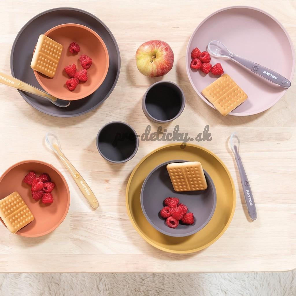 Štvordielny jedálenský set od Nattou z mäkkého silikónu je veľmi praktický, ľahko uchopiteľný a protišmykový. Set obsahuje tanierik a misku s prísavkou, hrnček a lyžičku. Zaoblené vnútorné hrany misky a tanierika uľahčujú naberanie potravín detičkám a ich rodičom.