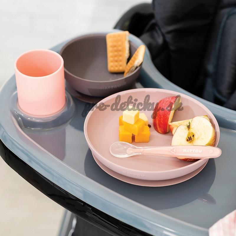 Štvordielny jedálenský set od Nattou z mäkkého silikónu je veľmi praktický, ľahko uchopiteľný a protišmykový. Set obsahuje tanierik a misku s prísavkou, hrnček a lyžičku. Zaoblené vnútorné hrany misky a tanierika uľahčujú naberanie potravín detičkám a ich rodičom.