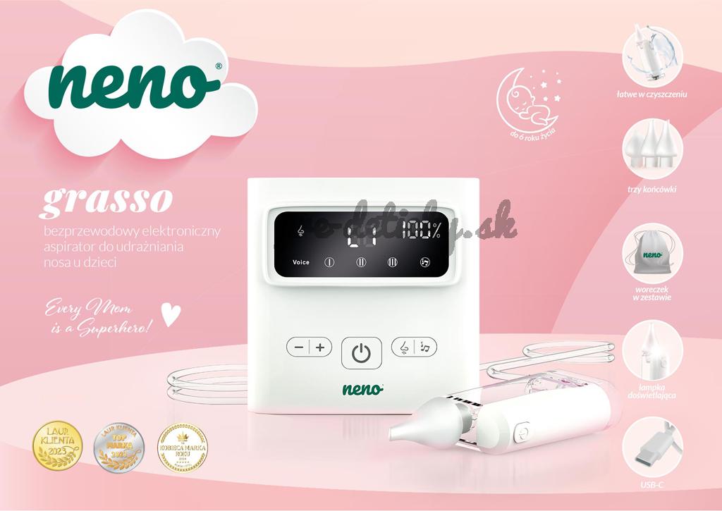 Neno Grasso je bezkáblový elektronický nosový odsávač hlienov pre deti od narodenia až do 6 rokov. Profesionálny pomocník pre jednoduché a účinné uvoľnenie dýchania vášho dieťaťa. Šetrne a efektívne odstraňuje hlieny rôznej hustoty, uľahčuje dýchanie a zlepšuje pohodu detí počas nádchy aj v bežných situáciách.