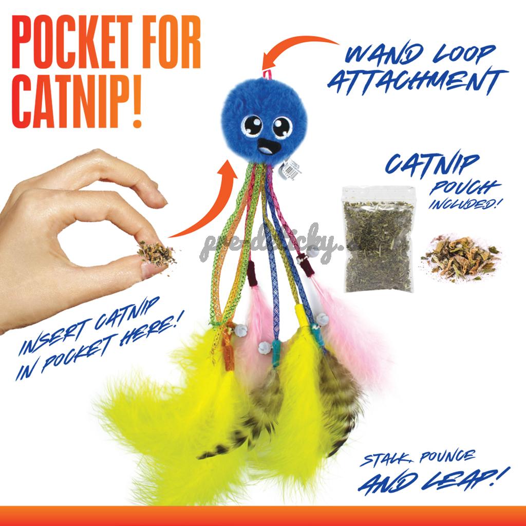 Telo hračky kombinuje odolný nylonový plášť s „ultraplush“ povrchom (mäkký, príjemný na dotyk) a pružné lanká/„nohy“ chobotnice, ktoré pri pohybe vibrujú alebo sa vlnia – to napodobňuje pohyb koristi a stimuluje mačku. V konštrukcii sú zabudované aj rolničky, ktoré zvyšujú záujem mačky o hru. Ďalej hračka obsahuje tyčku so šnúrou, čo umožňuje majiteľovi viesť hru - pohybovať hračkou vo vzduchu či po zemi, a tým aktivovať mačacie lovecké inštinkty.