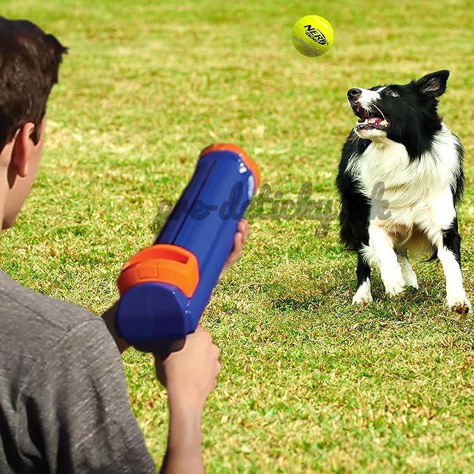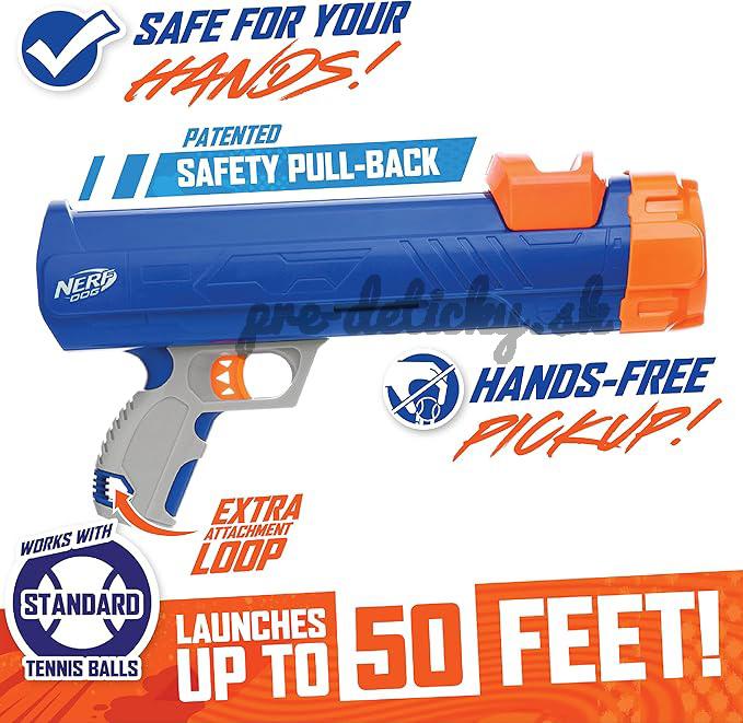 Nerf Dog Toy Blaster je ručne ovládaná hračka - zbraň určená na hru aportovania s vašim psom. Hračka sa používa tak, že naberiete jednu z priložených tenisových loptičiek do hlavice, stlačíte alebo natiahnete mechanizmus a vypustíte loptičku na väčšiu vzdialenosť, čím pes má výzvu ju chytiť a priniesť späť.