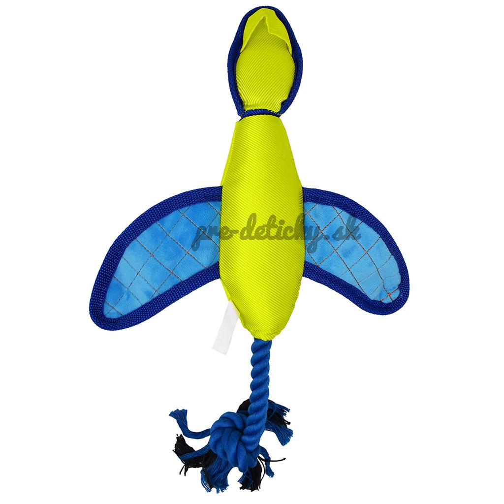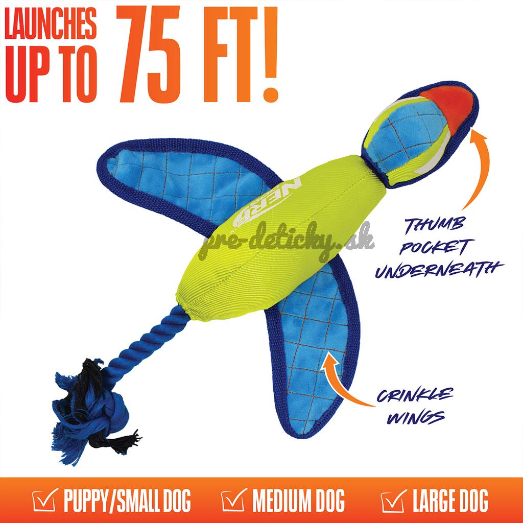 Hračka s dĺžkou približne 42 cm je navrhnutá pre aktívnu hru aportovania so psom – ideálna pre beh, odpaľovanie a chytanie na väčšiu vzdialenosť. Vysoký pomer zábavy zaisťuje dve hlavné vlastnosti: šuštiace krídla, ktoré pri hre vydávajú zvuk a stimulujú psa, a robustná konštrukcia z nylonu a odolných materiálov, ktorá zvládne časté hody a aportovanie v exteriéri.