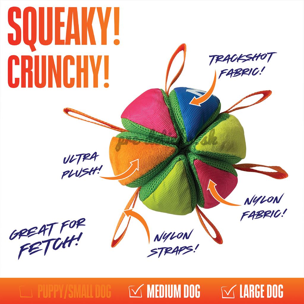Loptička je vyrobená z vnútornej sieťoviny odolnej proti roztrhnutiu, ktorá predlžuje jej životnosť aj pri intenzívnej hre. Kombinuje mäkký plyšový vonkajší vzhľad s vŕzgavými a šuštiacimi zvukmi, ktoré stimulujú zmysly vášho psa a udržujú jeho pozornosť.