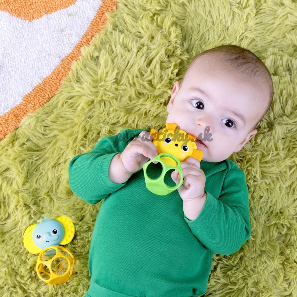 Vitajte v džungli - upokojujúcej džungli! Toto 2 balenie hryzátok obsahuje kamarátov leva a slona, ktorí pomôžu vášmu dieťatku upokojiť boľavé ďasná. Vyrobené pomocou flexibilnej a odolnej technológie Oball Bright Starts, jednoducho uchopiteľný tvar umožňuje dieťaťu chytiť hryzátko a samo sa upokojiť. Táto hračka pre bábätká je vyrobená s množstvom otvorov na prsty, ktoré sú vhodné pre ich malé ručičky a zároveň podporuje jemnú motoriku. Peek-a-boo! zrkadielko na zadnej strane hryzátka leva pomáha sebaobjavať. Zatraste hryzátkom slona, aby ste objavili hrkajúce korálky a potešili malé ušká bábätka! Hryzátka v tvare cumlíkov neobsahujú BPA pre 100% bezpečné prerezávanie zúbkov a hranie. Dvojnásobná zábava a dvojnásobné upokojenie pre vaše malé divoké dieťa! Vezmite si tieto hračky na cesty – obe hryzátka sú navrhnuté tak, aby sa zmestili do štandardnej tašky na plienky. Ľahko sa tiež čistia - jednoducho utrite vlhkou handričkou a jemným mydlom. Tieto hračky sú navrhnuté pre novorodencov a staršie deti a sú skvelými darčekmi na každú príležitosť.