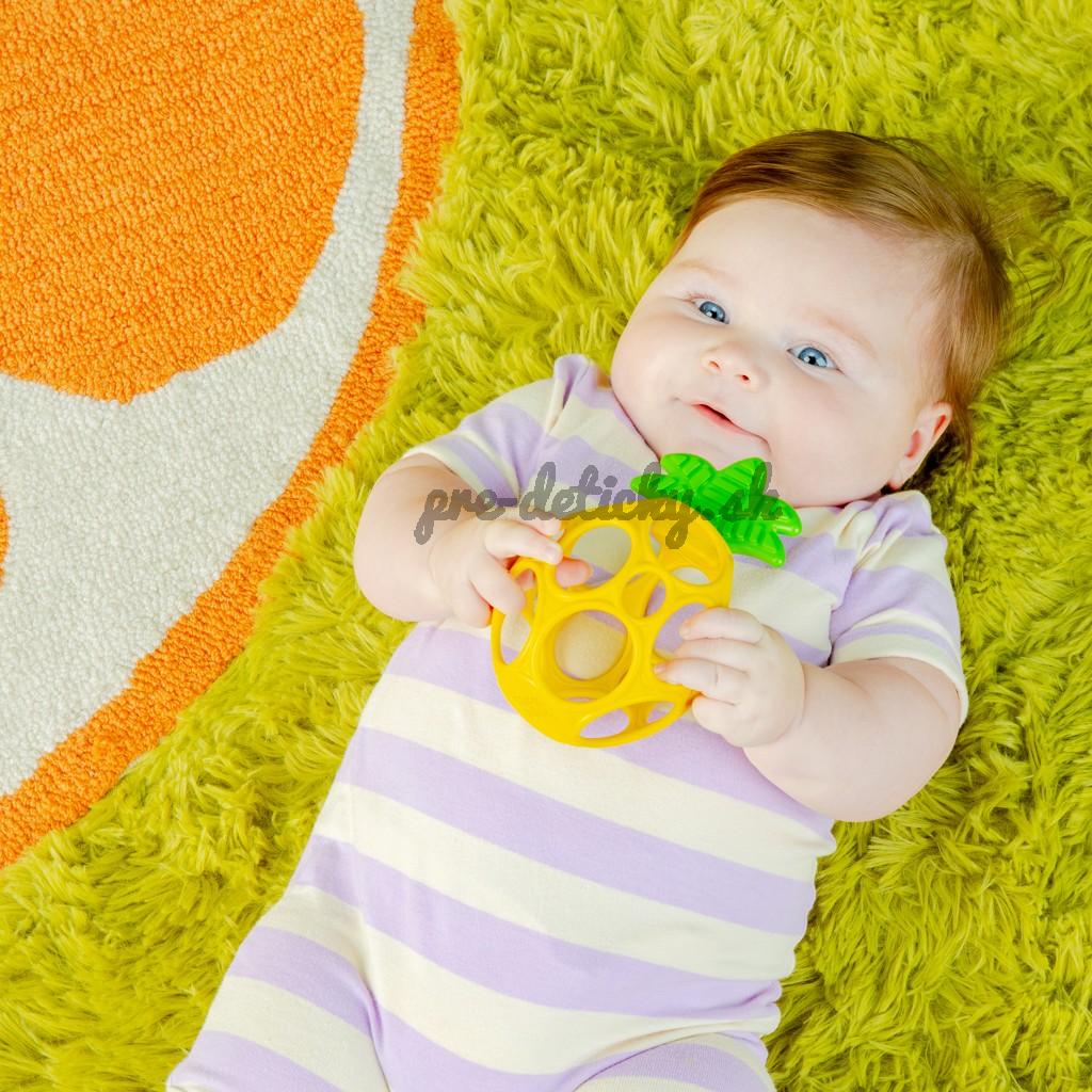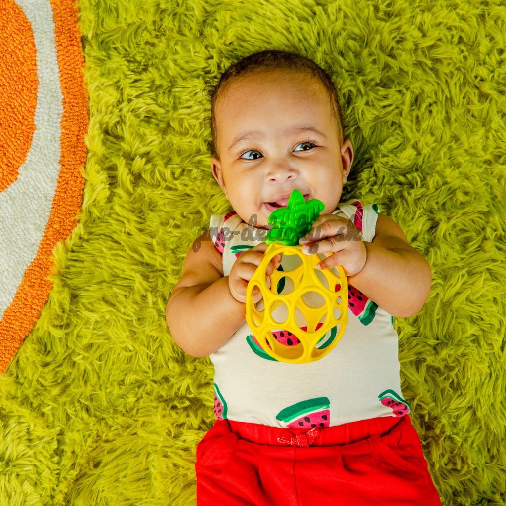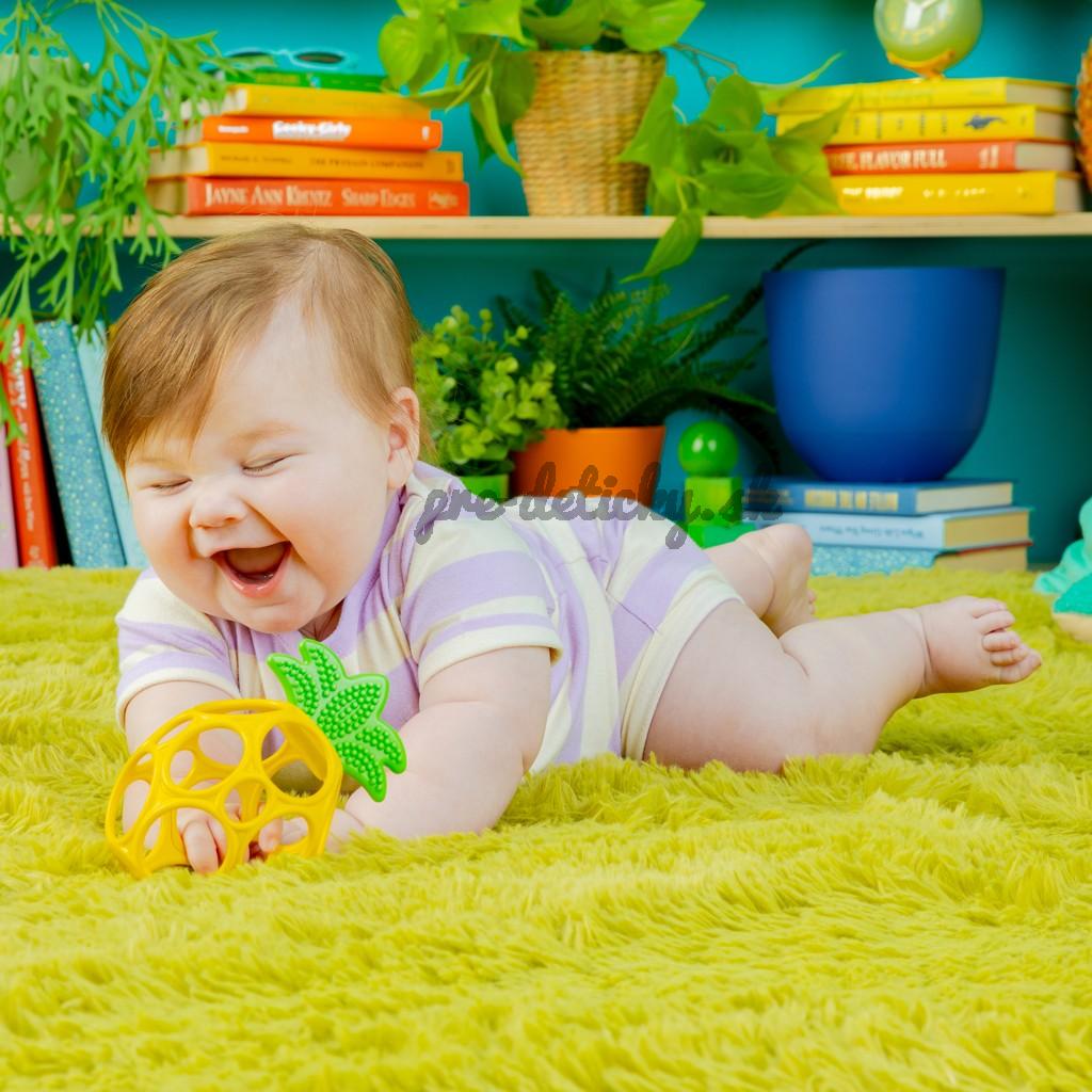 - Ľahko uchopiteľné ananásové hryzátko vyrobené z flexibilnej a odolnej technológie Oball od Bright Starts má otvory na prsty pre malé ručičky na držanie a hranie.