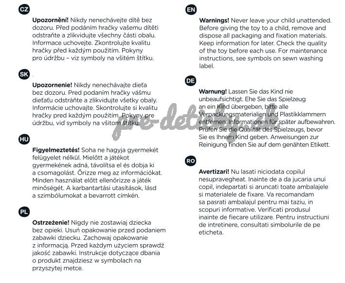UPOZORNENIE! Nikdy nenechávajte dieťa bez dozoru. Pred podaním hračky vášmu dieťaťu odstráňte a zlikvidujte všetky obaly. Informácie uchovajte. Skontrolujte si kvalitu hračky pred každým použitím. Pokyne pre údržbu, vid symboly na všitom štítku.