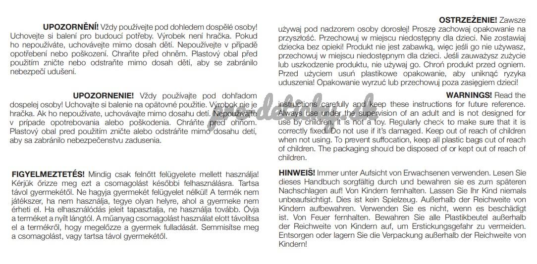 UPOZORNENIE Vždy používajte pod dohľadom dospelej osoby! Uchovajte si balenie na opätovné použitie. Výrobok nie je hračka. Ak ho nepoužívate, uchovávajte mimo dosahu detí. Nepoužívajte v prípade opotrebovania alebo poškodenia. Chráňte pred ohňom. Plastový obal zničte, alebo udržujte mimo dosah detí, aby sa zabránilo nebezpečenstvu udusenia.