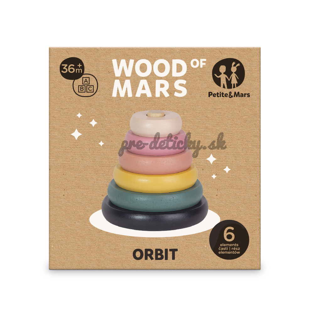 Drevená skladacia hračka ORBIT v tvare pyramídy je kombináciou farebných diskov rôznych veľkostí. Každý disk bol starostlivo opracovaný a nemá ostré hrany, čo zaručuje bezpečnú hru pre malé deti.