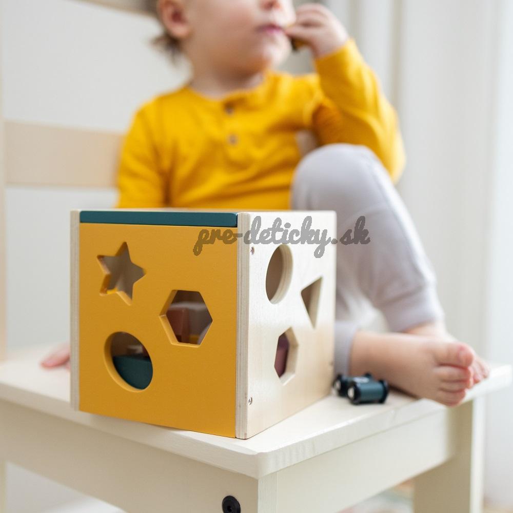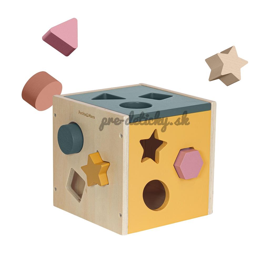 Súprava obsahuje drevenú kocku so štyrmi stranami na triedenie a 12 farebných kociek rôznych tvarov, napríklad trojuholníka, hviezdy, štvorca, kosoštvorca alebo kruhu.