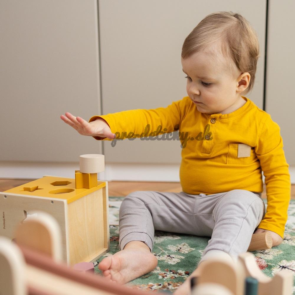 Drevená triediaca hračka GRAVITY rozvíja manuálne zručnosti dieťatka, podporuje jemnú motoriku, logické myslenie a učí vzťahy príčiny a následku.