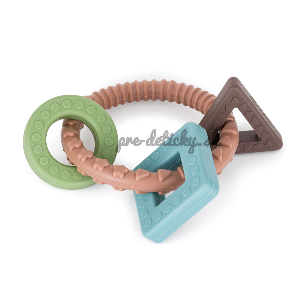 Mäkké silikónové hryzátko pozostávajúce z krúžku s 3 zaujímavými prvkami je vyrobené výhradne z potravinárskeho silikónu bez obsahu BPA. Najkvalitnejšie odolné materiály zaručujú bezpečnosť vášho dieťatka počas hry a prerezávania zúbkov. Pružný silikón je dokonale vhodný pre citlivé detské ďasienka. Pomáha zmierniť bolesť, ktorá vzniká pri prerezávaní zúbkov, pretože pri hryzení hryzátka sa jemne masírujú ďasná. Hryzátko možno schladiť v chladničke a dať dieťatku studené. Rôzne povrchy hryzátka stimulujú správny vývoj čeľuste.