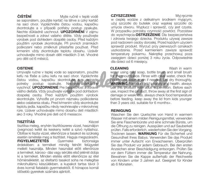 UPOZORNENIE Pre bezpečnosť a zdravie vášho dieťaťa. Vždy používajte výrobok pod dohľadom dospelej osoby. Pred každým použitím výrobok skontrolujte. Vyhoďte pri prvom náznaku poškodenia alebo oslabenia obalu. Pred kŕmením vždy skontrolujte teplotu jedla. Kapsičku nikdy neohrievajte v mikrovlnnej rúre. Uzáver uchovávajte mimo dosahu detí mladších ako 3 roky. Vhodné pre deti od 6 mesiacov.