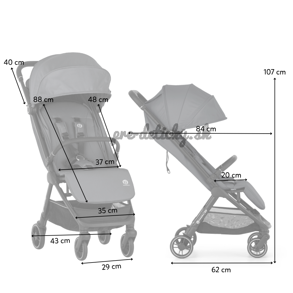 - Rozmery rozloženého kočíka: 84 cm (dĺžka od predného kolieska k rukoväti) × 35 cm (šírka) × 107 cm (výška)