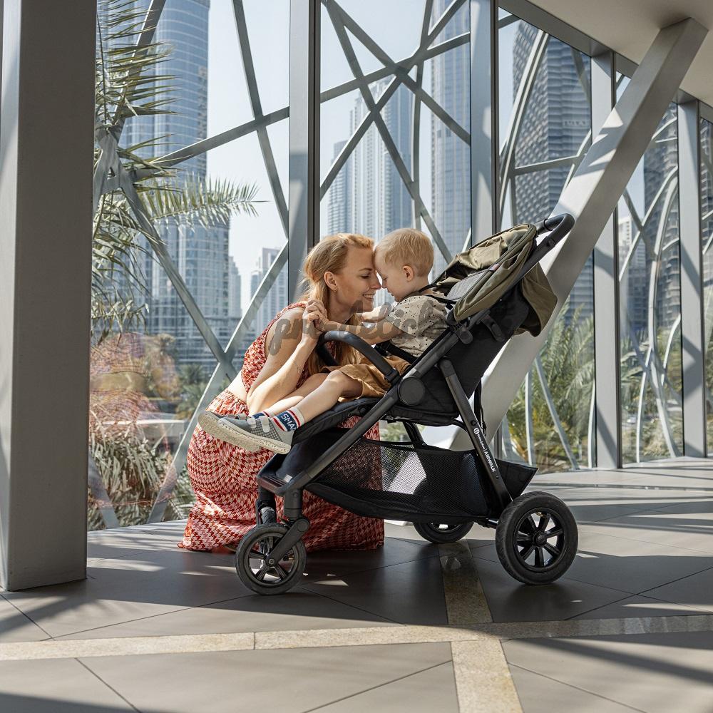 Praktický, priestranný, odpružený športový kočík s nafukovacími kolieskami je vhodný do terénu aj na námestia s kamennými dlažbami. Príjemne prekvapí jeho jednoduchá manipulácia a skladanie. Napriek tomu, že sa jedná o väčší športový kočík, je pomerne ľahký a po zložení nezaberá veľa miesta.