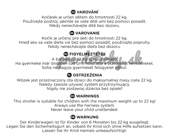 UPOZORNENIE! Kočík je určený pre deti do hmotnosti 22 kg. Hneď, ako sa vaše dieťa vie bez pomoci posadiť, používajte popruhy. Nikdy nenechávajte dieťa bez dozoru.