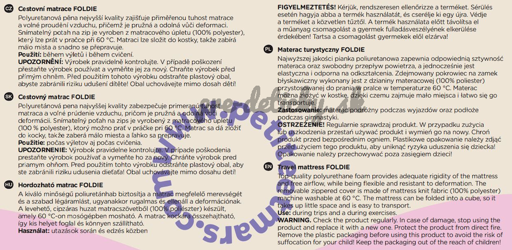 Snímateľný poťah na zips je vyrobený z matracovej pleteniny, ktorú možno prať v práčke pri teplote 60 ̊C. Matrac sa dá zložiť do kocky, takže zaberá málo miesta a ľahko sa prenáša. Súčasťou balenia je taška na prenášanie s praktickou rukoväťou, vďaka ktorej sa matrac aj ľahko skladuje.