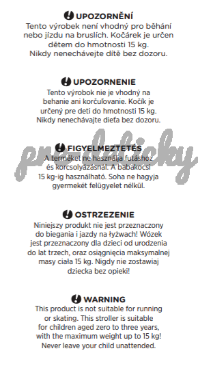 UPOZORNENIE! Tento výrobok nie je vhodný na behanie alebo korčuľovanie. Kočík je určený pre deti do hmotnosti 15 kg. Nikdy nenechávajte dieťa bez dozoru.