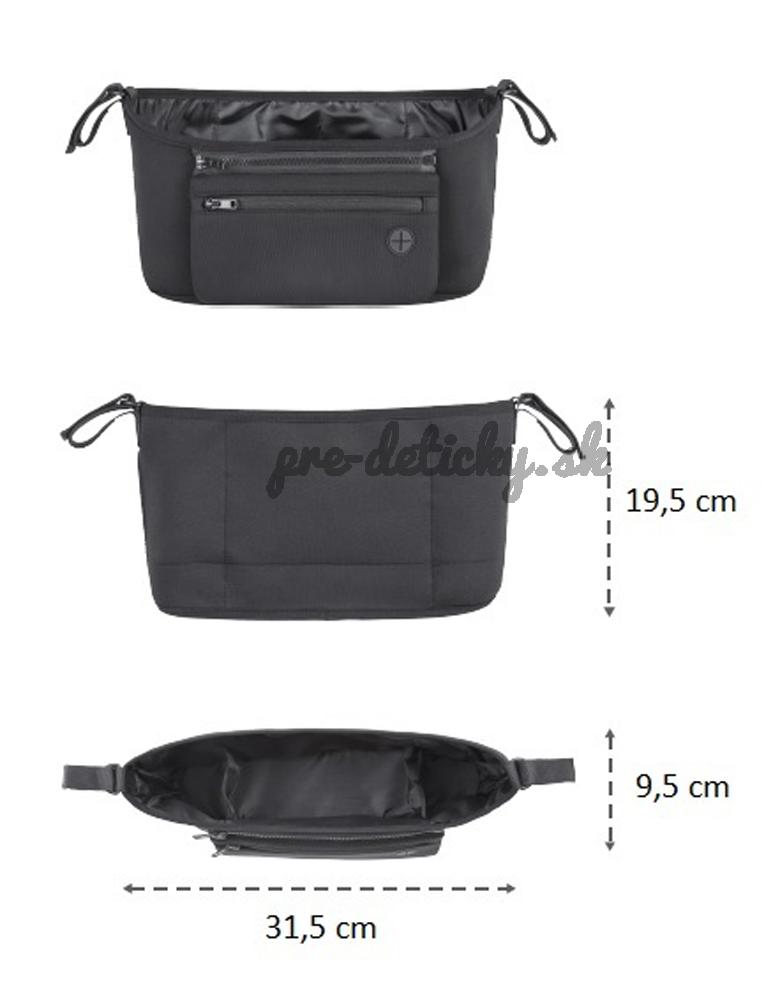 Dve bočné priehradky uskladnia fľašku, či termosku alebo pohár s kávou. Do veľkej prostrednej priehradky ľahko zmestíte všetko čo potrebujete počas prechádzky či výletu. Predné odnímateľné vrecko môžete používať aj samostatne. Je vhodné na uskladnenie mobilu a obsahuje aj port pre slúchadlá, takže počas kočíkovania môžete počúvať svoju obľúbenú hudbu, prípadne telefonovať. Pokiaľ si urobíte zastávku na detskom ihrisku, jednoducho odzipsujete vrecko s mobilom a inými cennosťami a vezmete si ho so sebou.