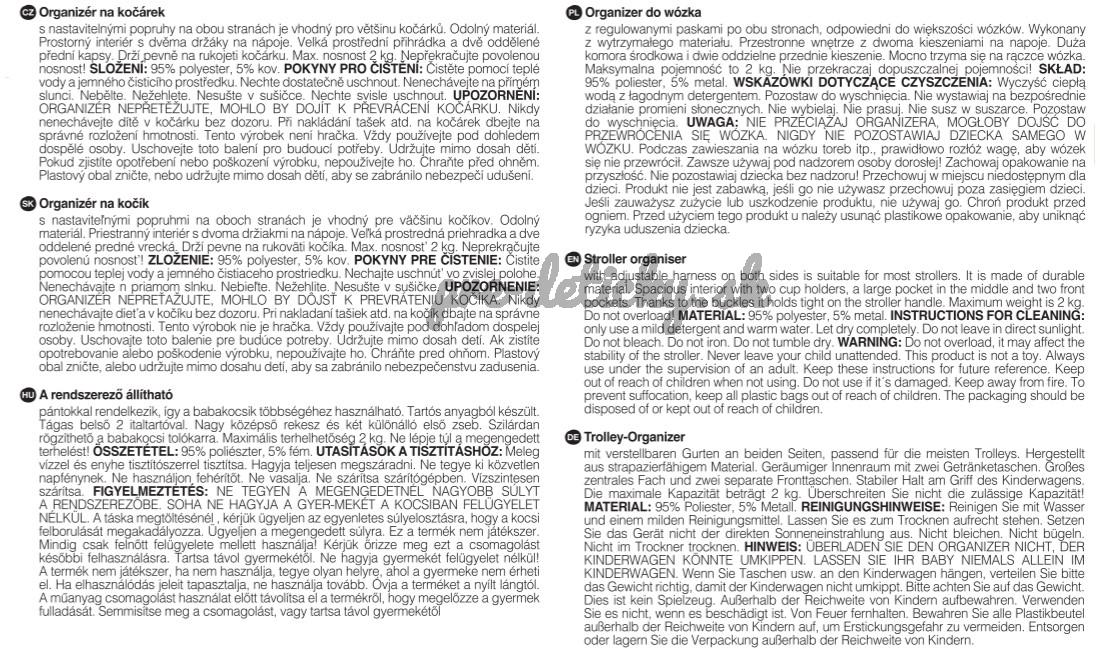 UPOZORNENIE! Tašku nepreťažujte, mohlo by dôjsť k prevráteniu kočíka! Nikdy nenechávajte dieťa v kočíku bez dozoru. Pri nakladaní tašiek na kočík dbajte na správne rozloženie hmotnosti. Tento výrobok nie je hračka. Vždy používajte pod dohľadom dospelej osoby. Uschovajte si toto balenie pre budúce potreby. Ak zistíte opotrebenie alebo poškodenie výrobku, nepoužívajte ho. Chráňte pred ohňom. Plastový obal zničte, alebo udržujte mimo dosahu detí, aby sa zabránilo nebezpečenstvu udusenia.